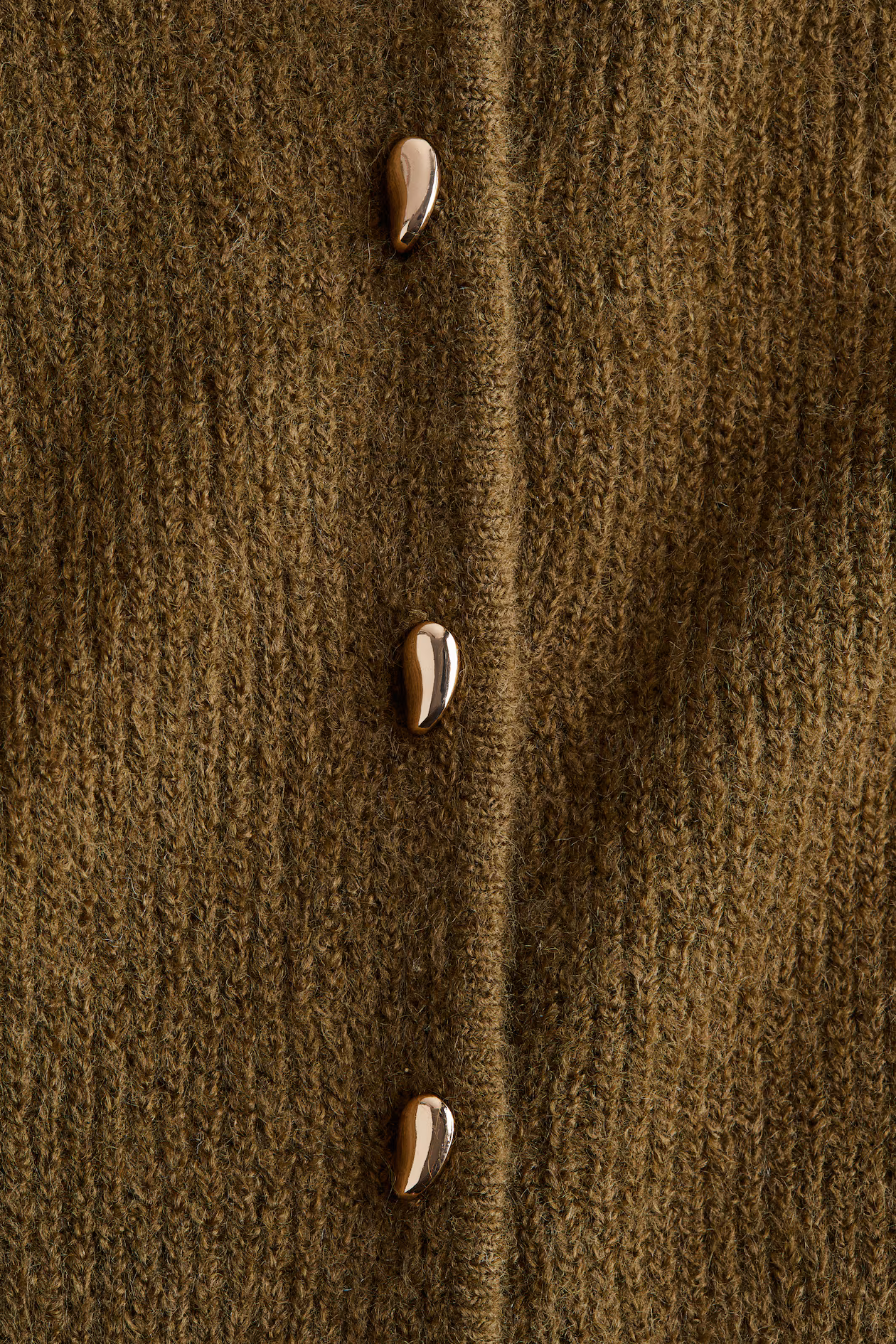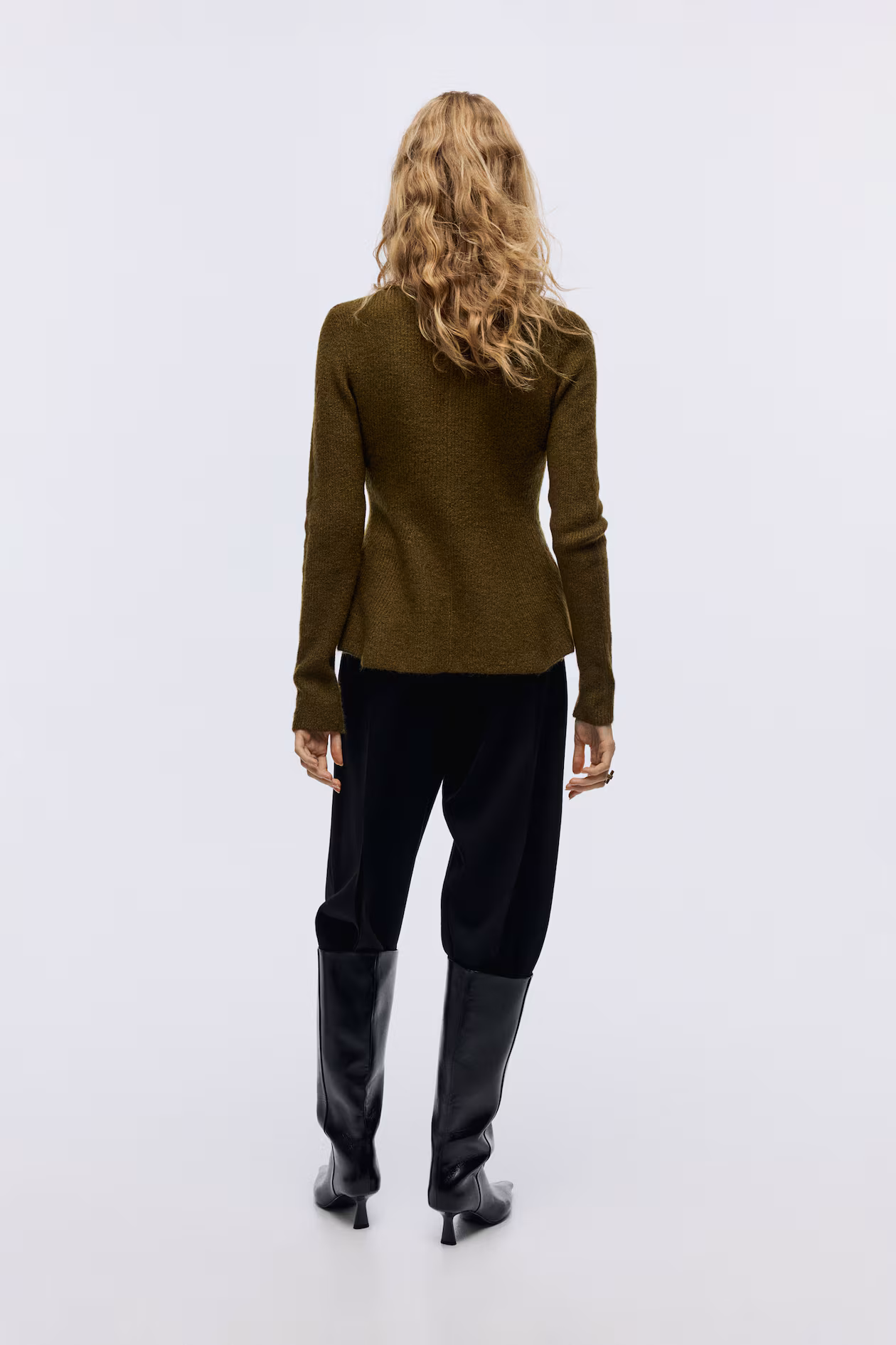 Fitted cardigan in a soft rib knit. Round neckline, metal buttons at front, and a fully fashioned section that creates a peplum.