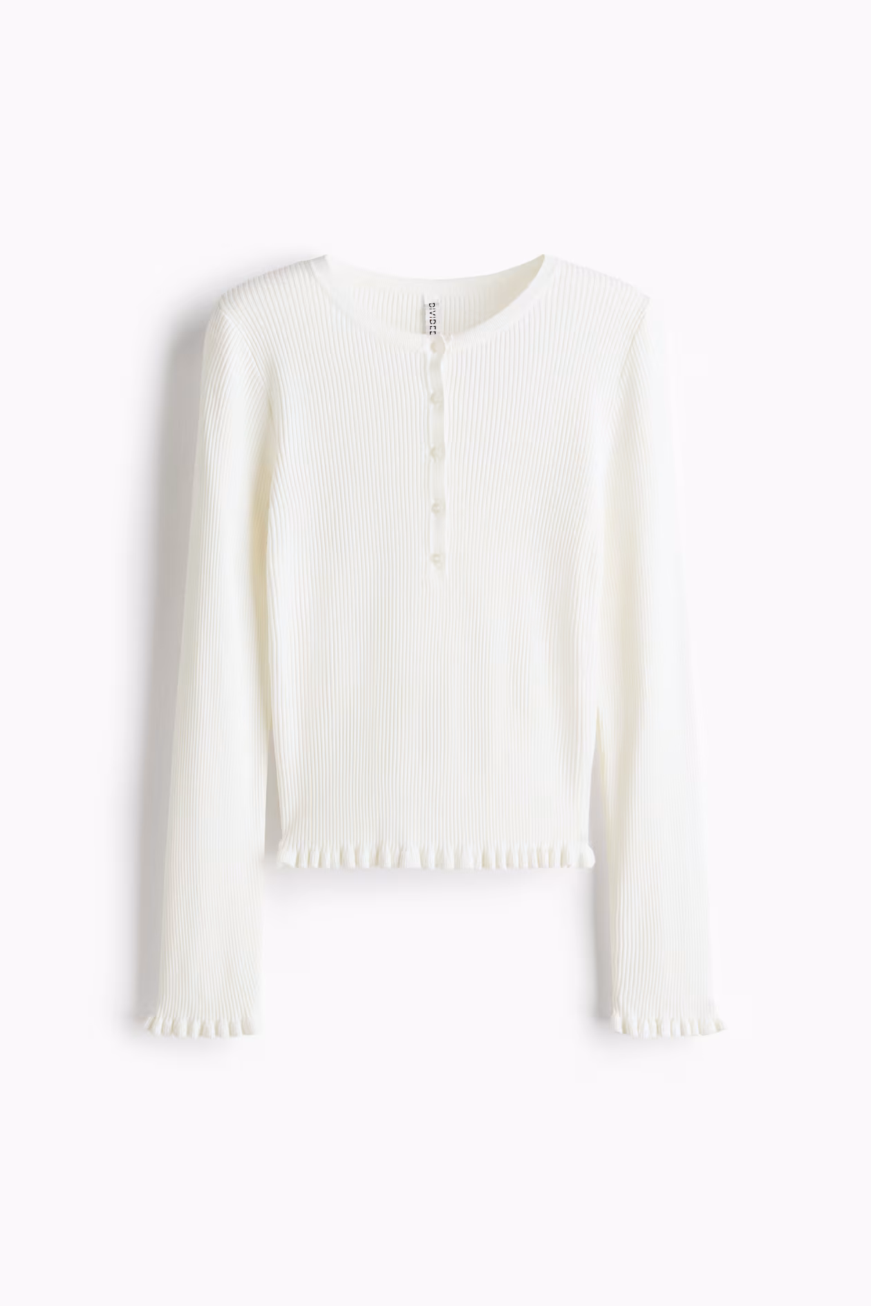 Fitted top in a fine rib knit. Round neckline, short button placket, and long sleeves. Ruffle trim at cuffs and hem.