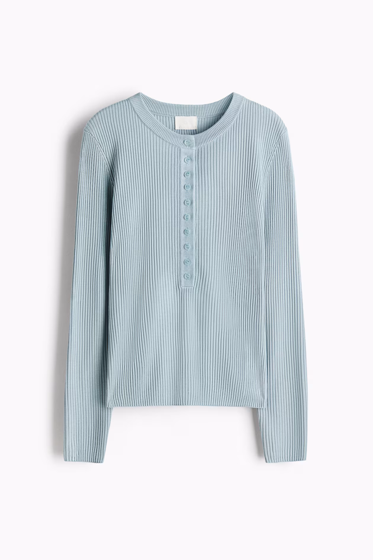 Fitted, rib-knit top. Round neckline, button placket, and long sleeves.