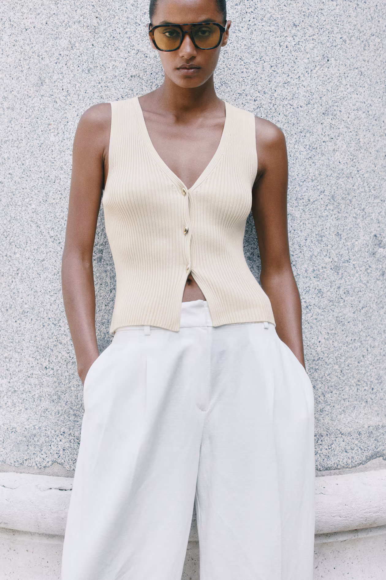 Fitted vest in a rib-knit viscose blend. Low-cut V-neck and oval metal buttons at front.