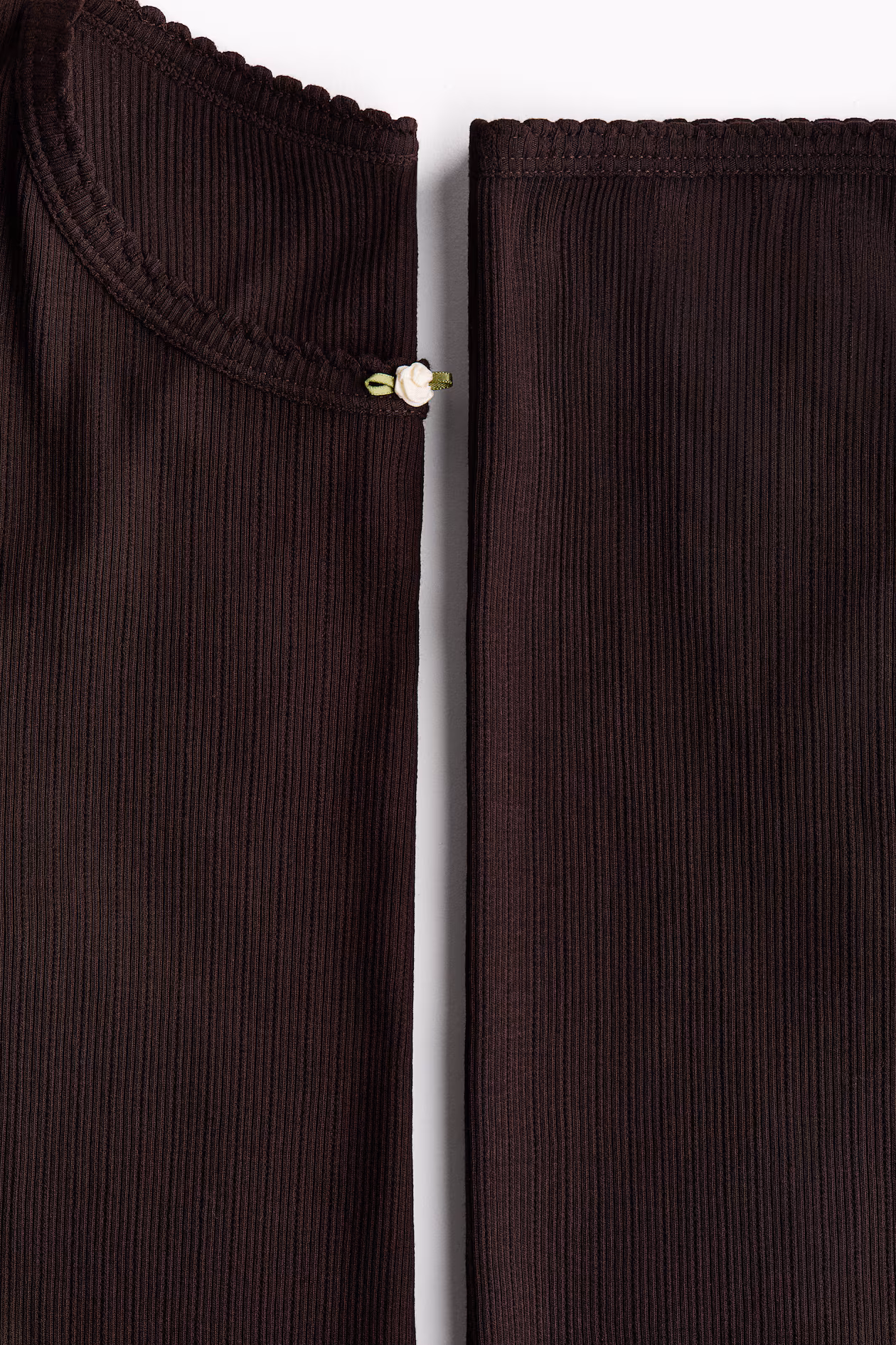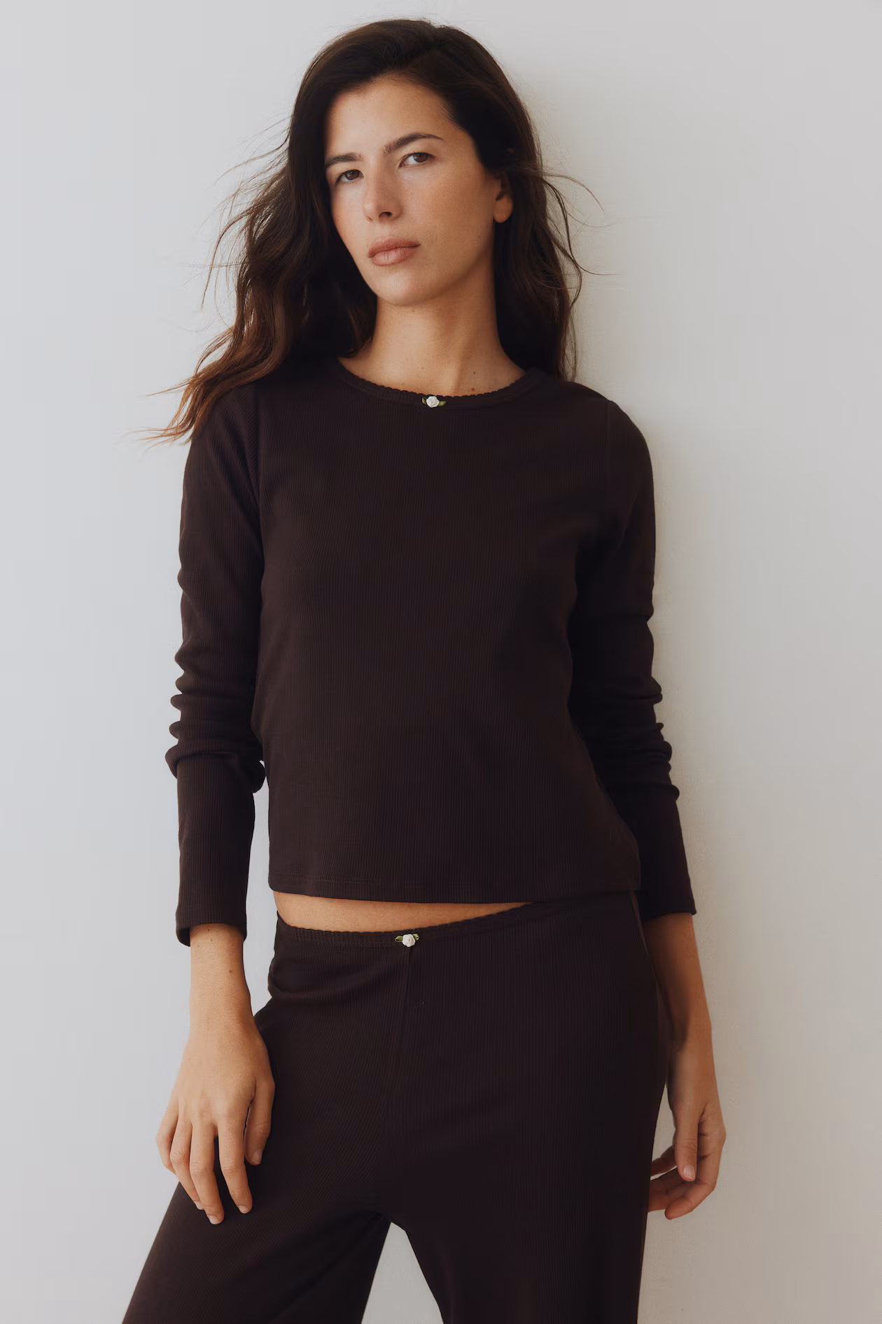 Pajamas in ribbed jersey with a top and pants, both with a small rose appliqué at front. Long-sleeved top with a round neckline and pants with an elasticized waistband.
