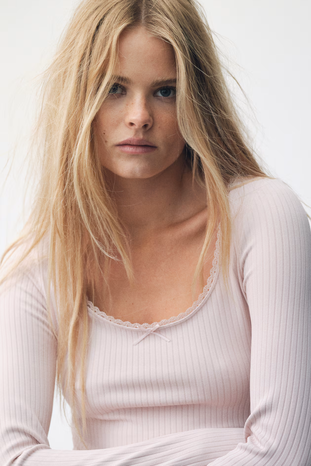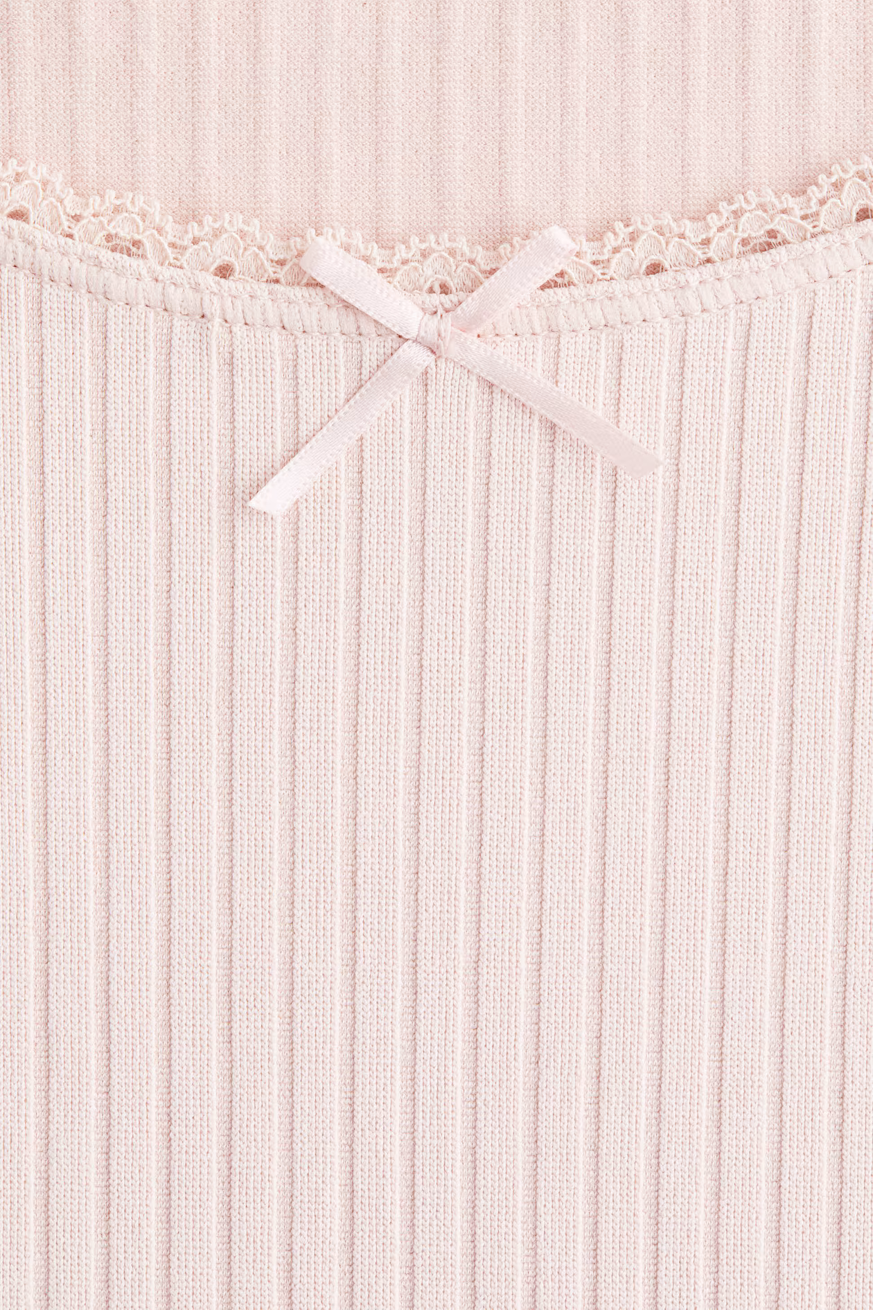 Short, fitted, long-sleeved top in ribbed jersey. Low-cut, lace-trimmed neckline with a delicate satin bow at center.