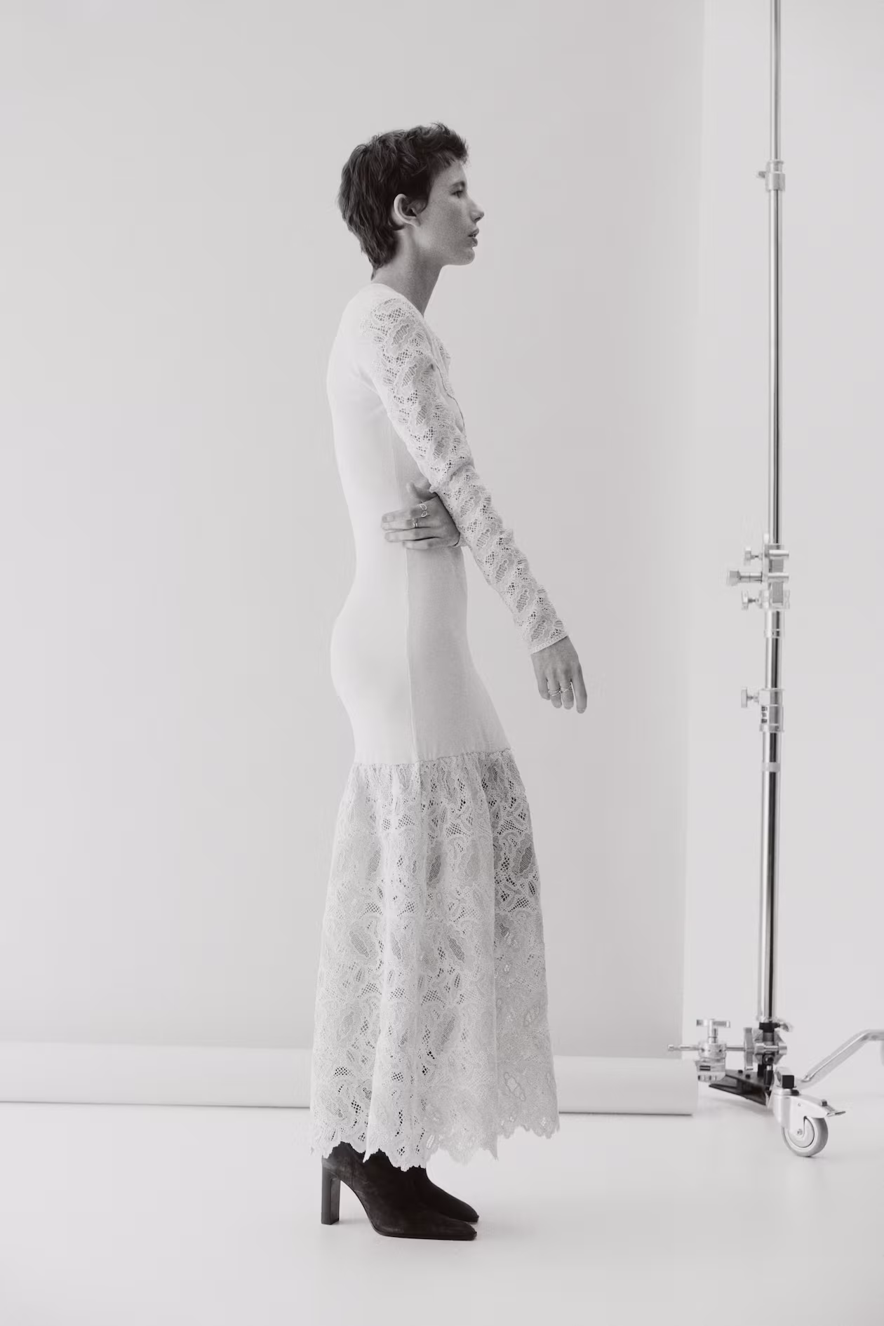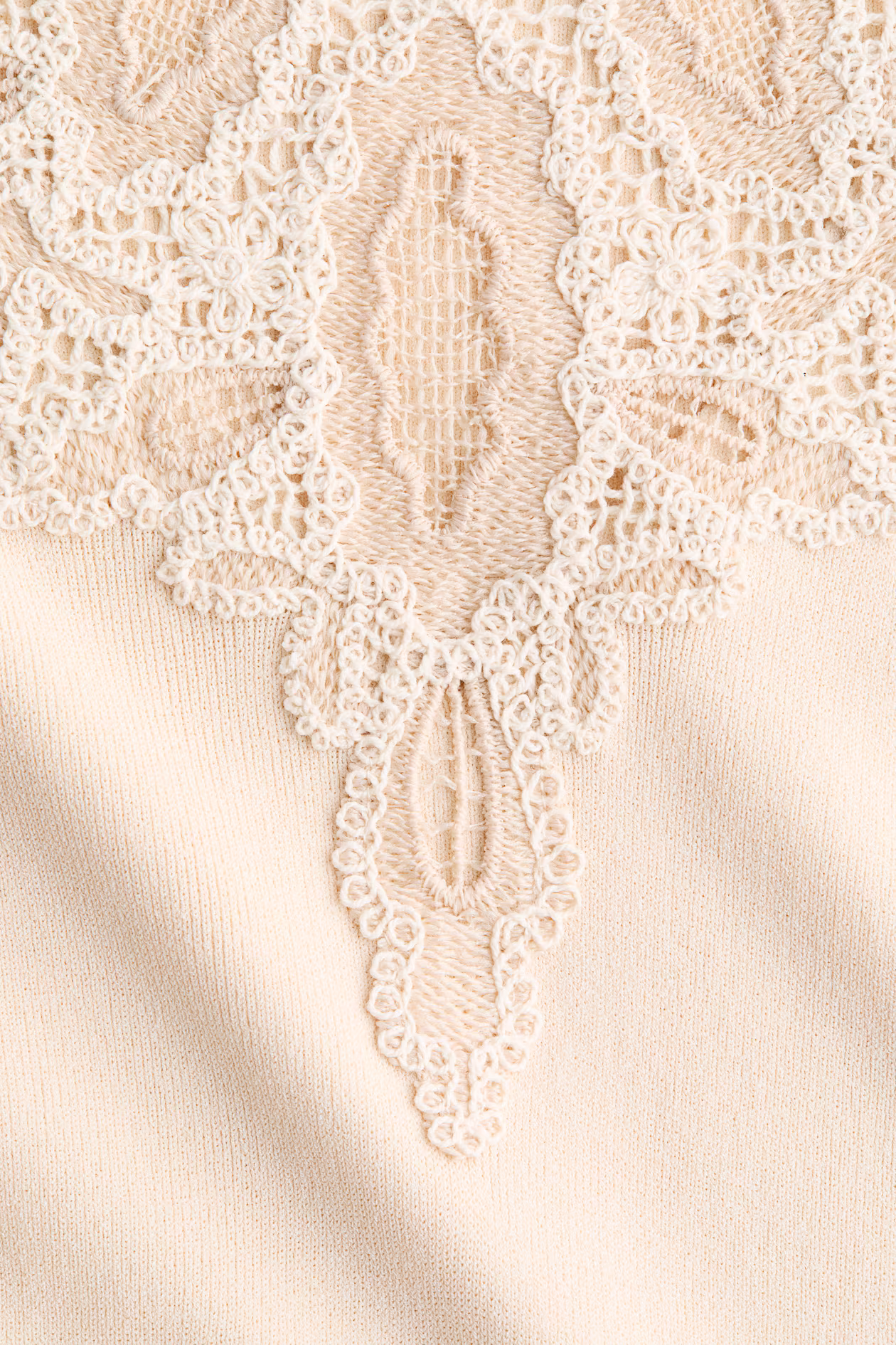 Long, fitted dress in ribbed jersey with a crochet-look lace inset at front and along sleeves. Round neckline, and a gathered seam below hips with a wide crochet-look panel to hem.