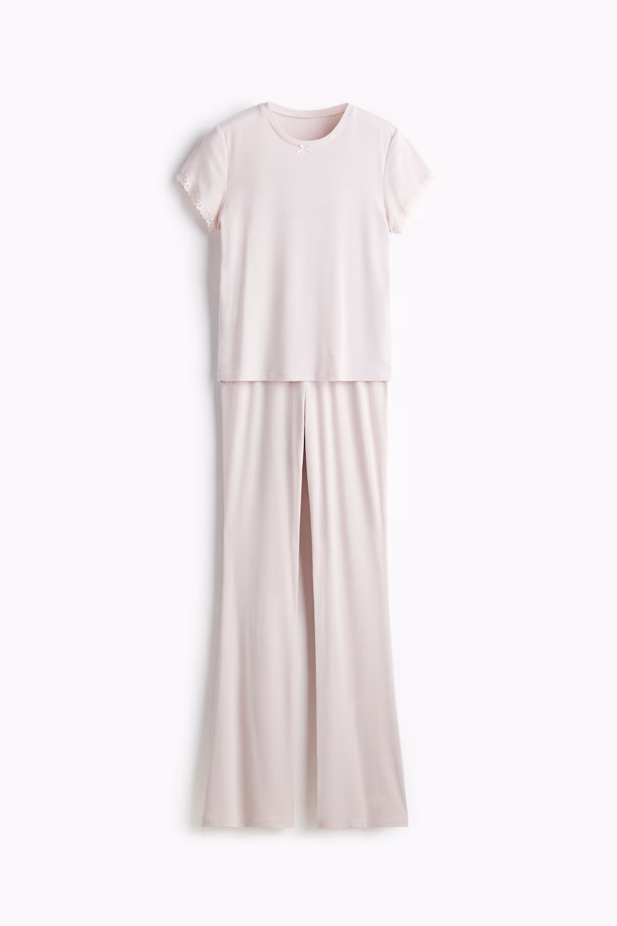 Pajamas in ribbed modal jersey with a top and pants. Top with a round neckline and short sleeves with lace-trimmed cuffs. Pants with an elasticized waistband and gently flared legs.