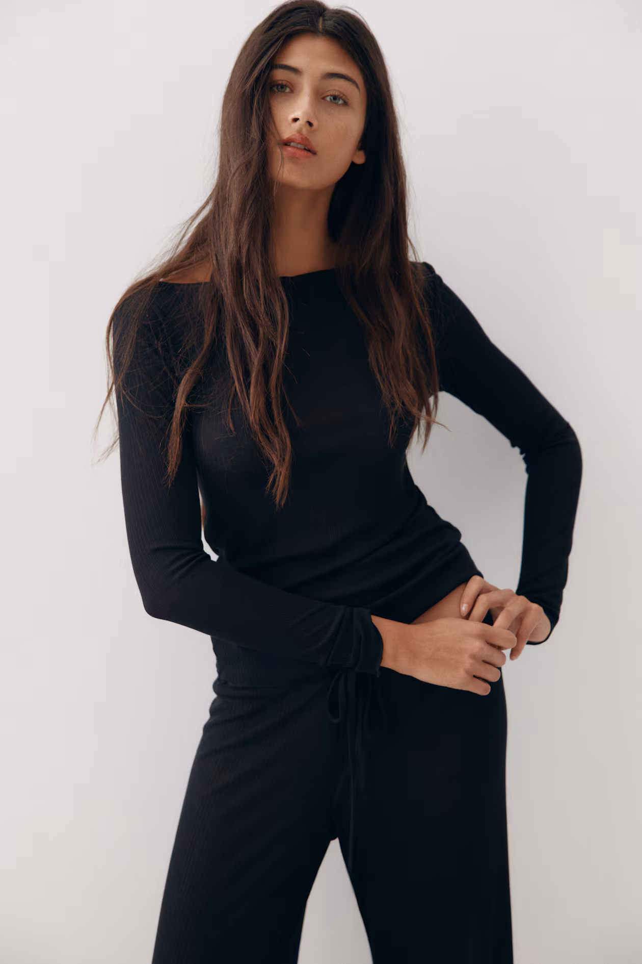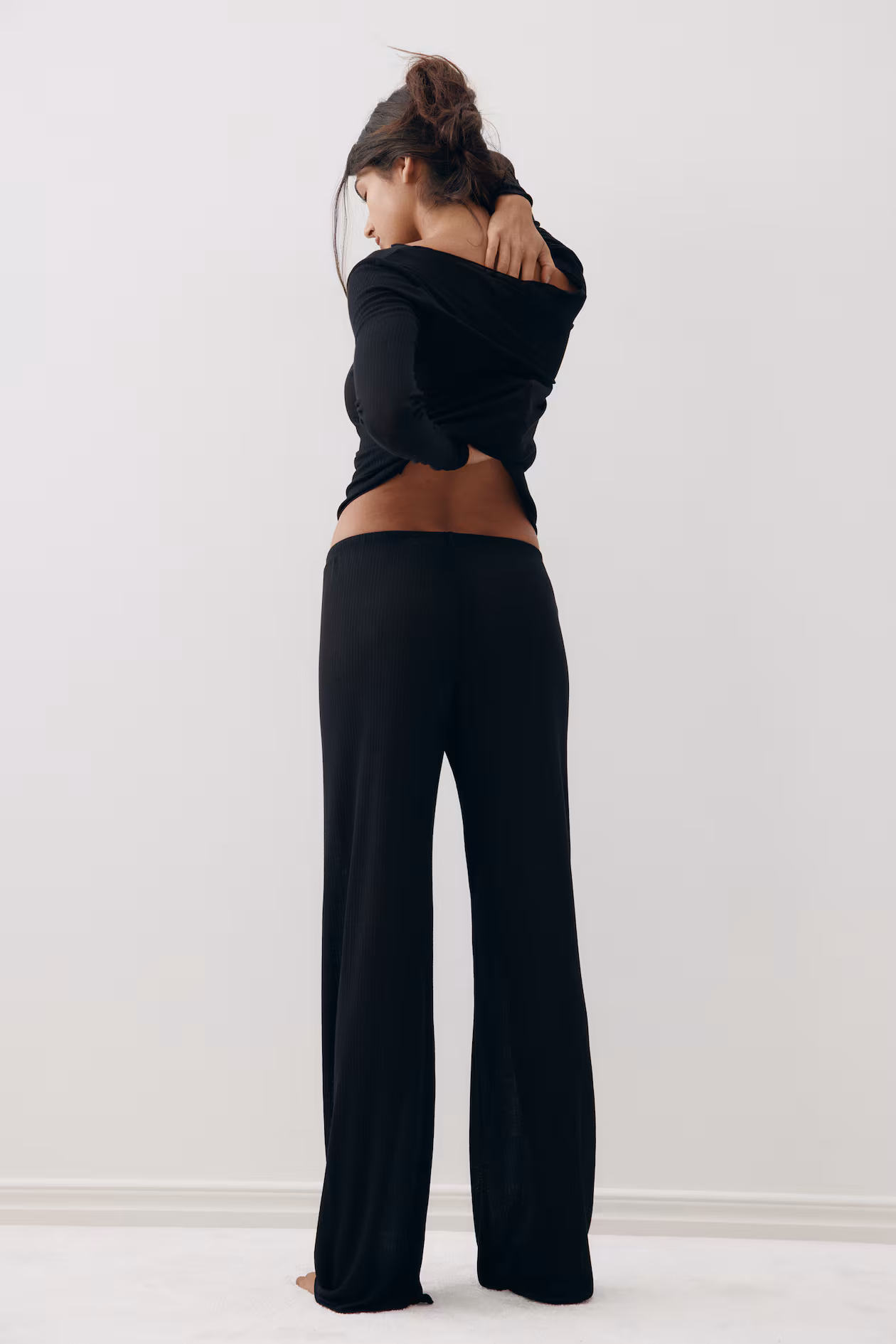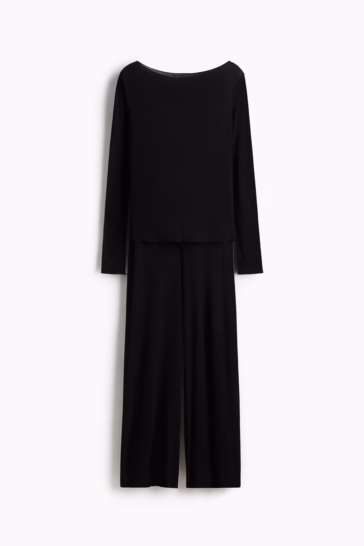 Pajama top and pants in sheer, ribbed jersey with overlocked edges. Fitted top with a boat neck and long sleeves. Pants with an elasticized, drawstring waistband and wide legs.