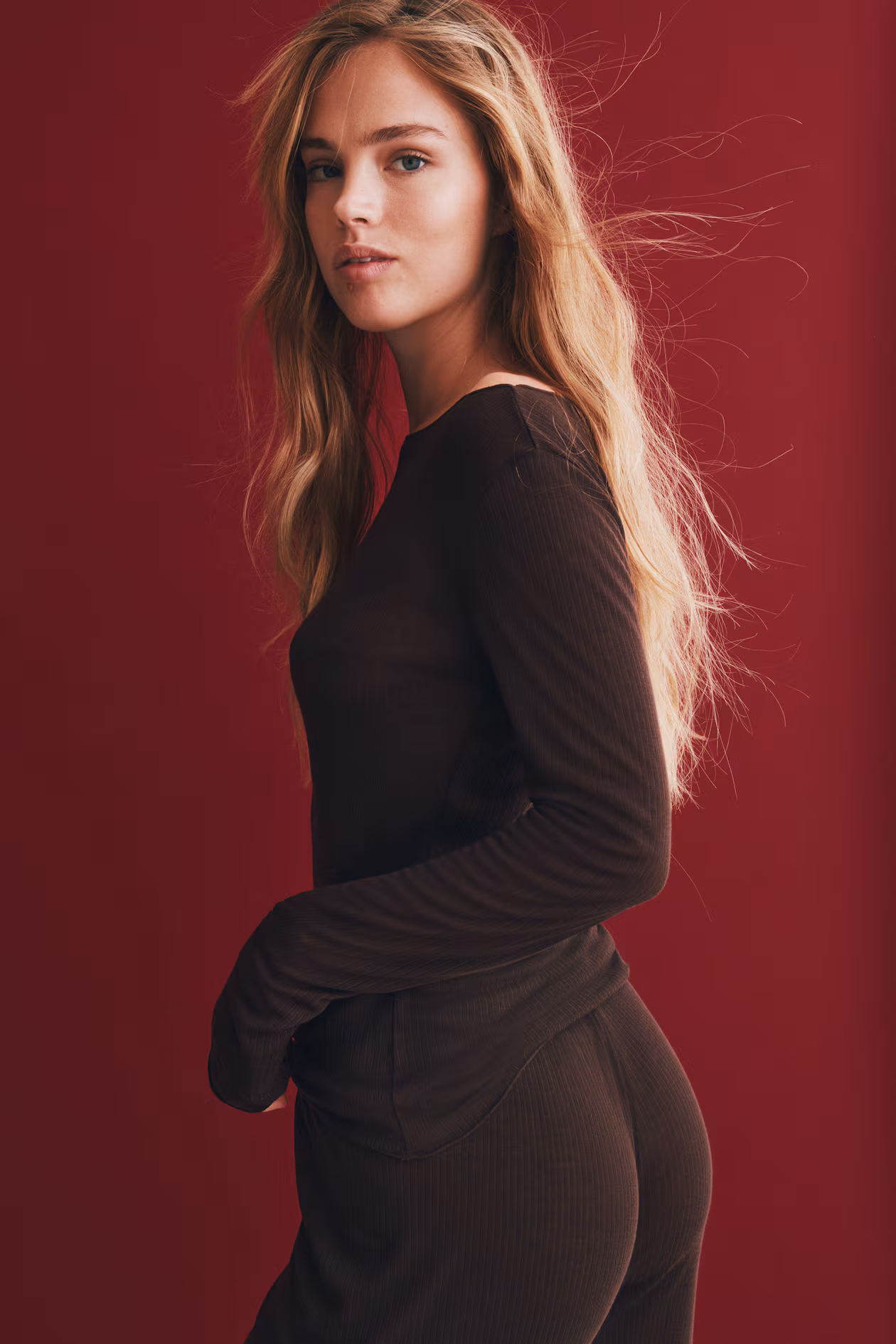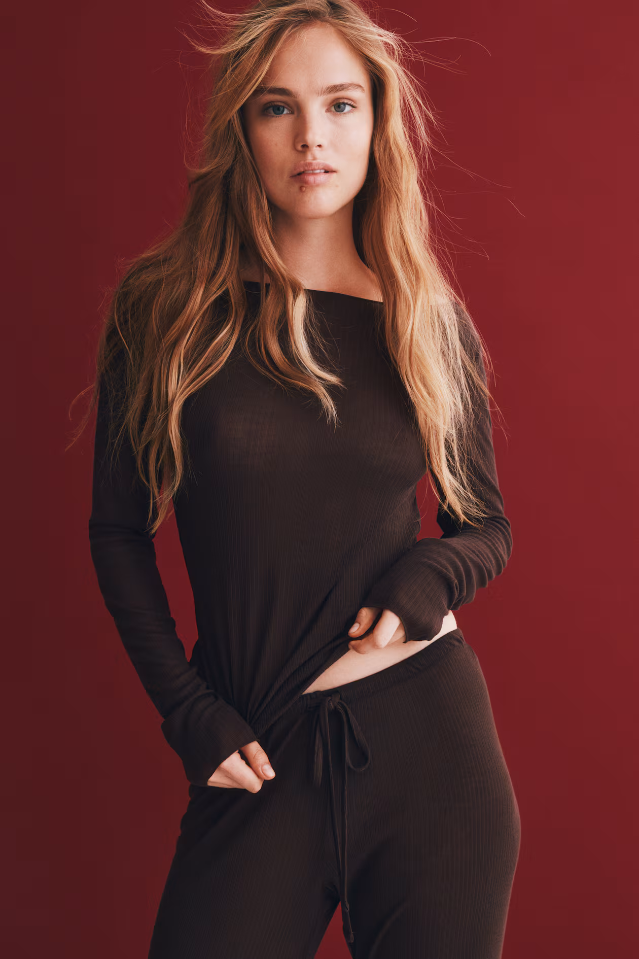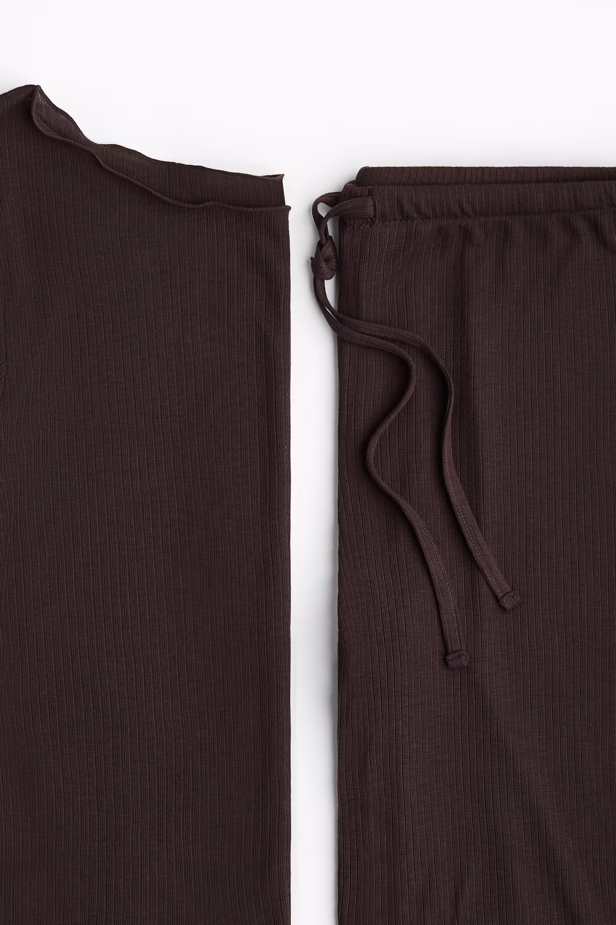Pajama top and pants in sheer, ribbed jersey with overlocked edges. Fitted top with a boat neck and long sleeves. Pants with an elasticized, drawstring waistband and wide legs.