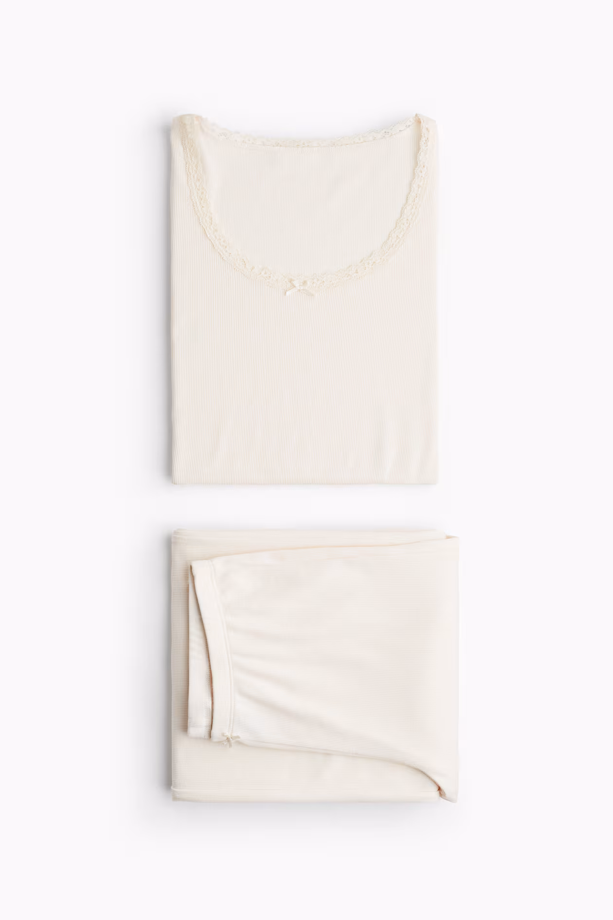 Pajamas in soft, ribbed jersey. Short-sleeved top with a low-cut, lace-trimmed neckline and overlocked edges at cuffs and hem. Pants with an elasticized waistband with decorative satin bow and straight legs with overlocked hems.