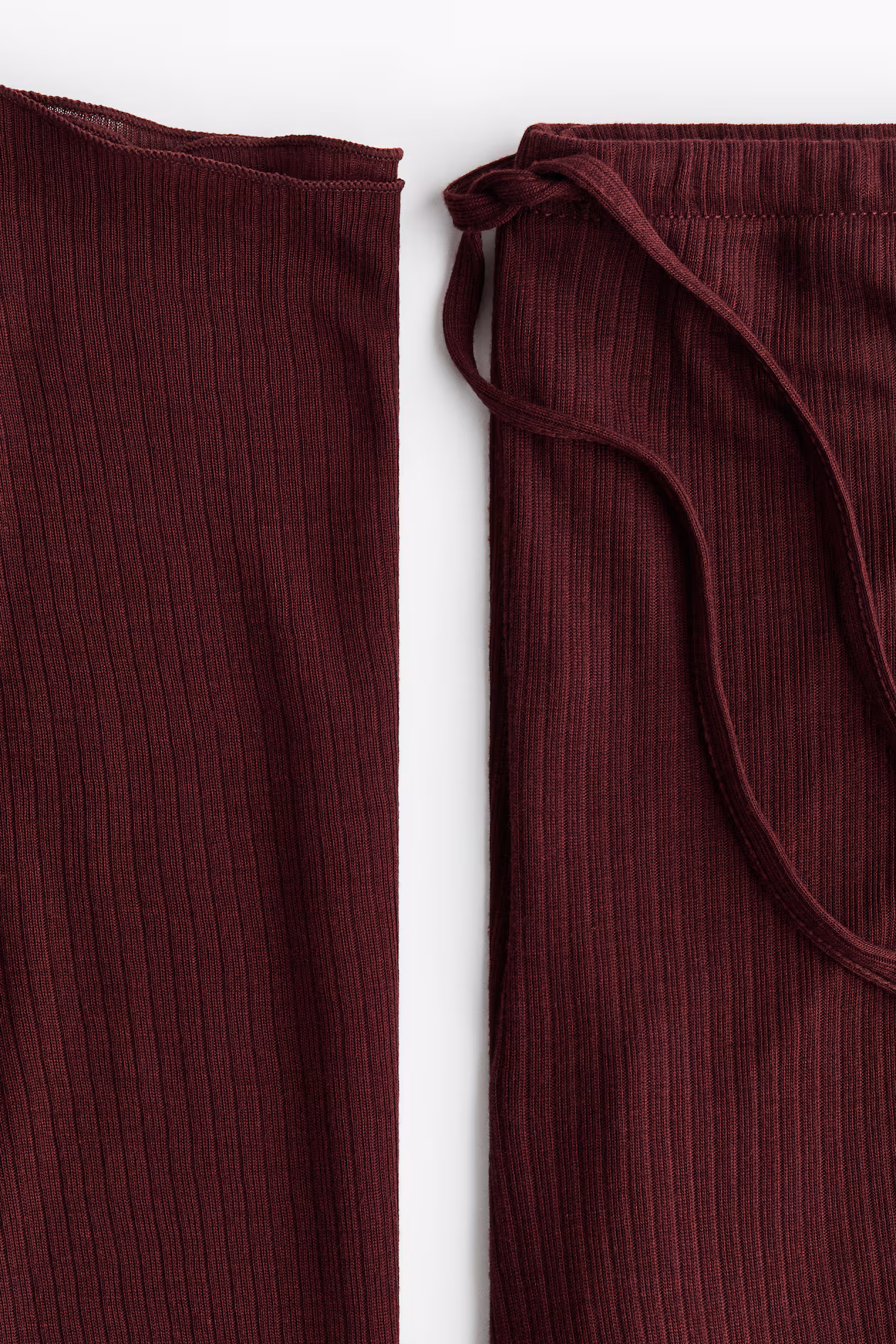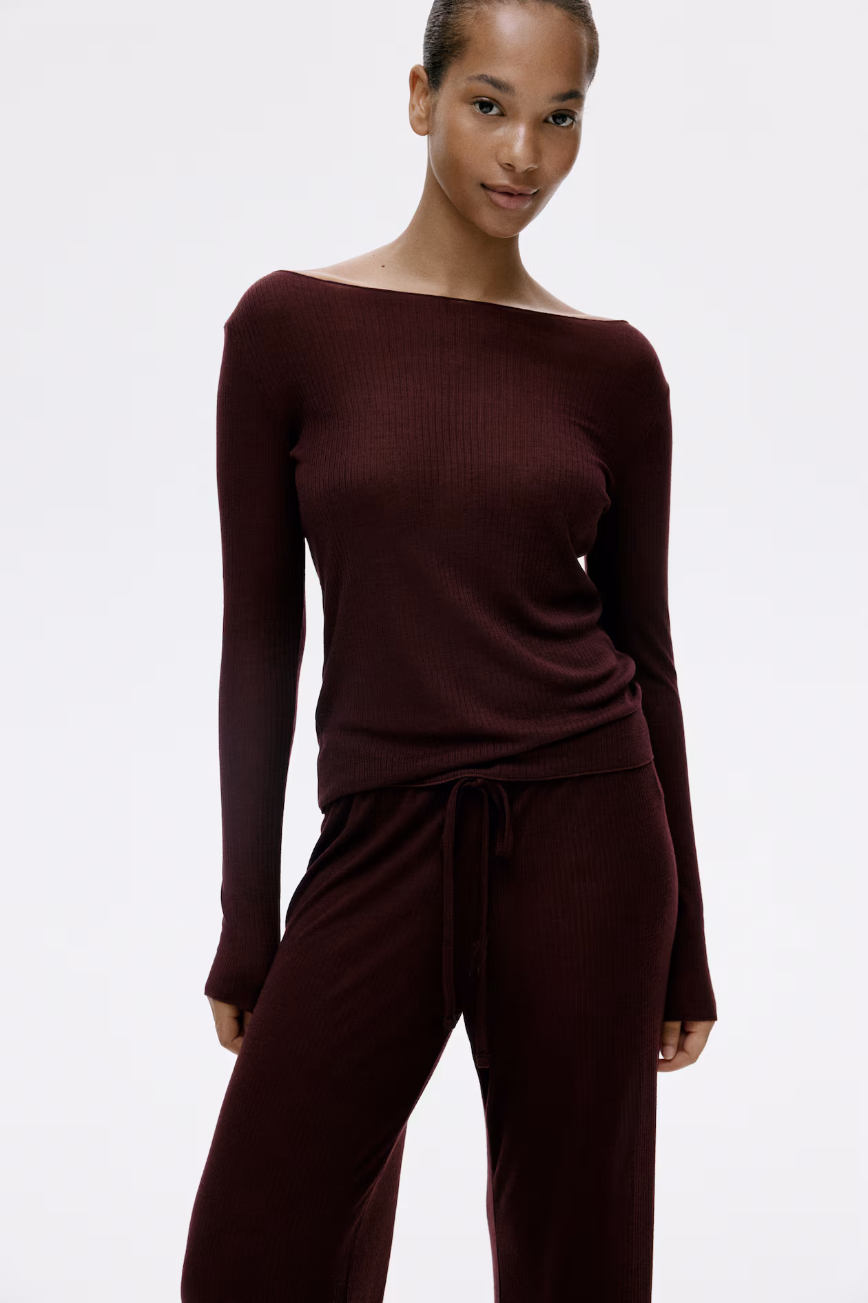 Pajama top and pants in sheer, ribbed jersey with overlocked edges. Fitted top with a boat neck and long sleeves. Pants with an elasticized, drawstring waistband and wide legs.