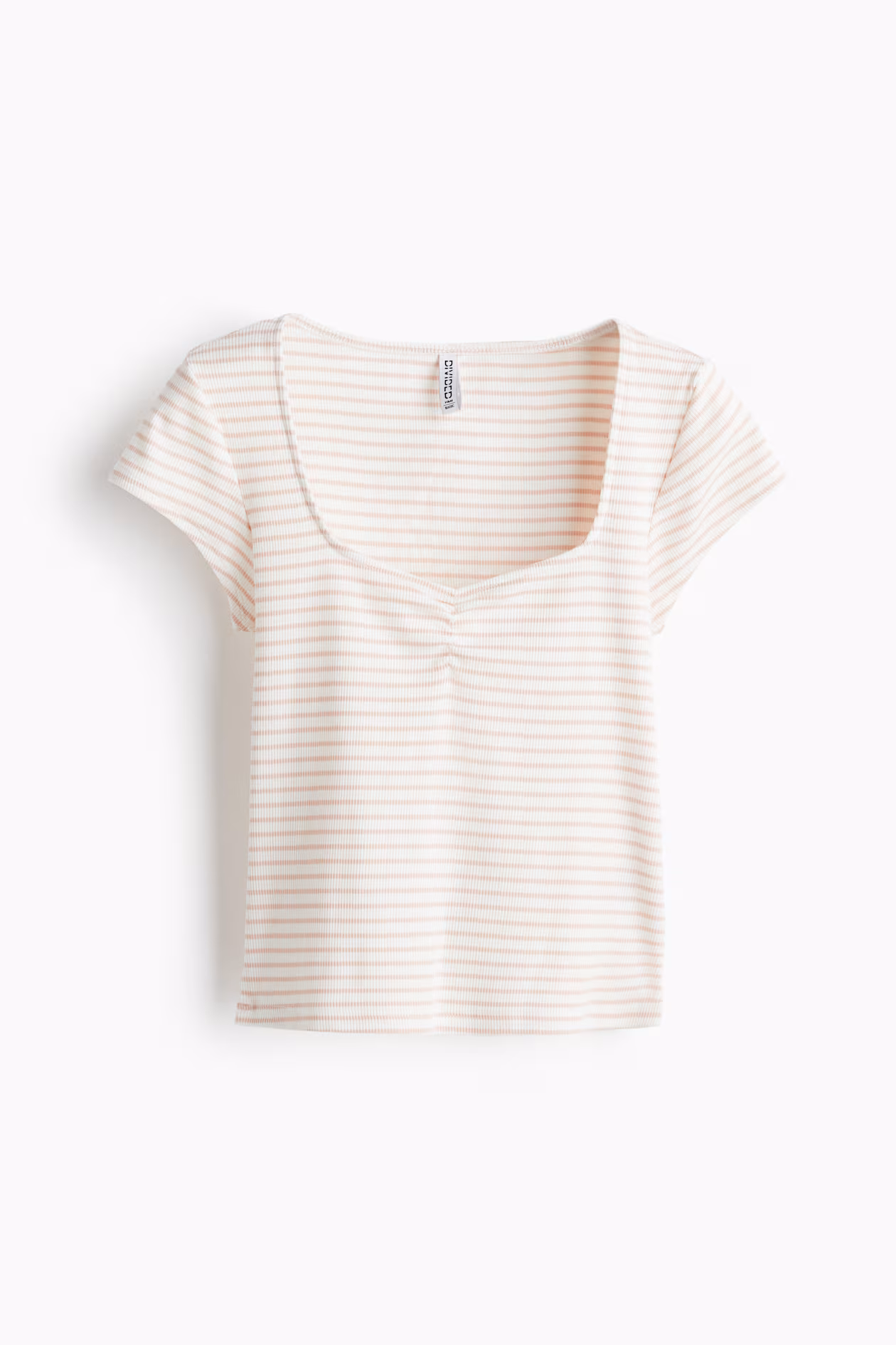 Short, fitted T-shirt in ribbed cotton jersey. Sweetheart neckline, gathered seam at center bust, and a straight-cut hem.