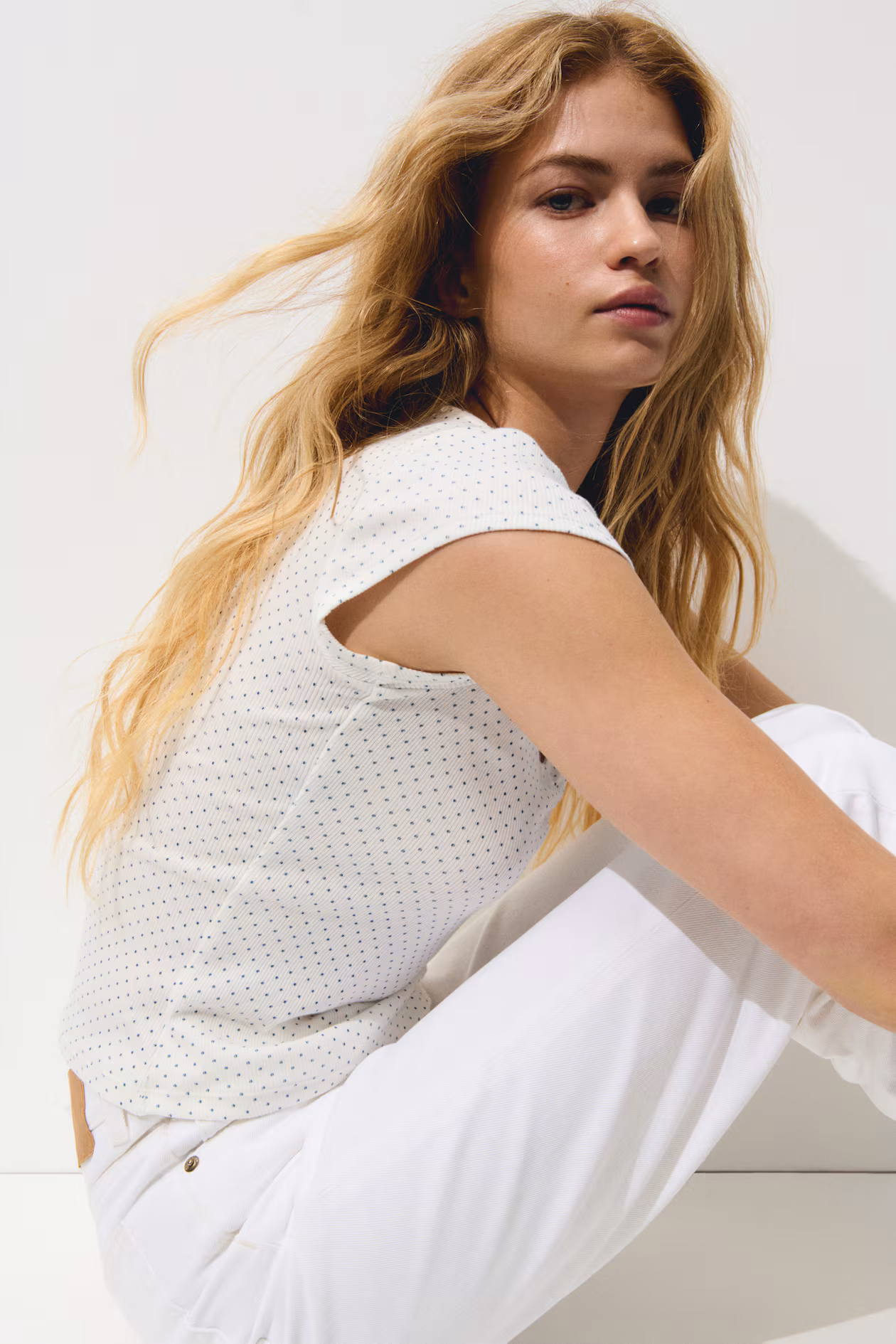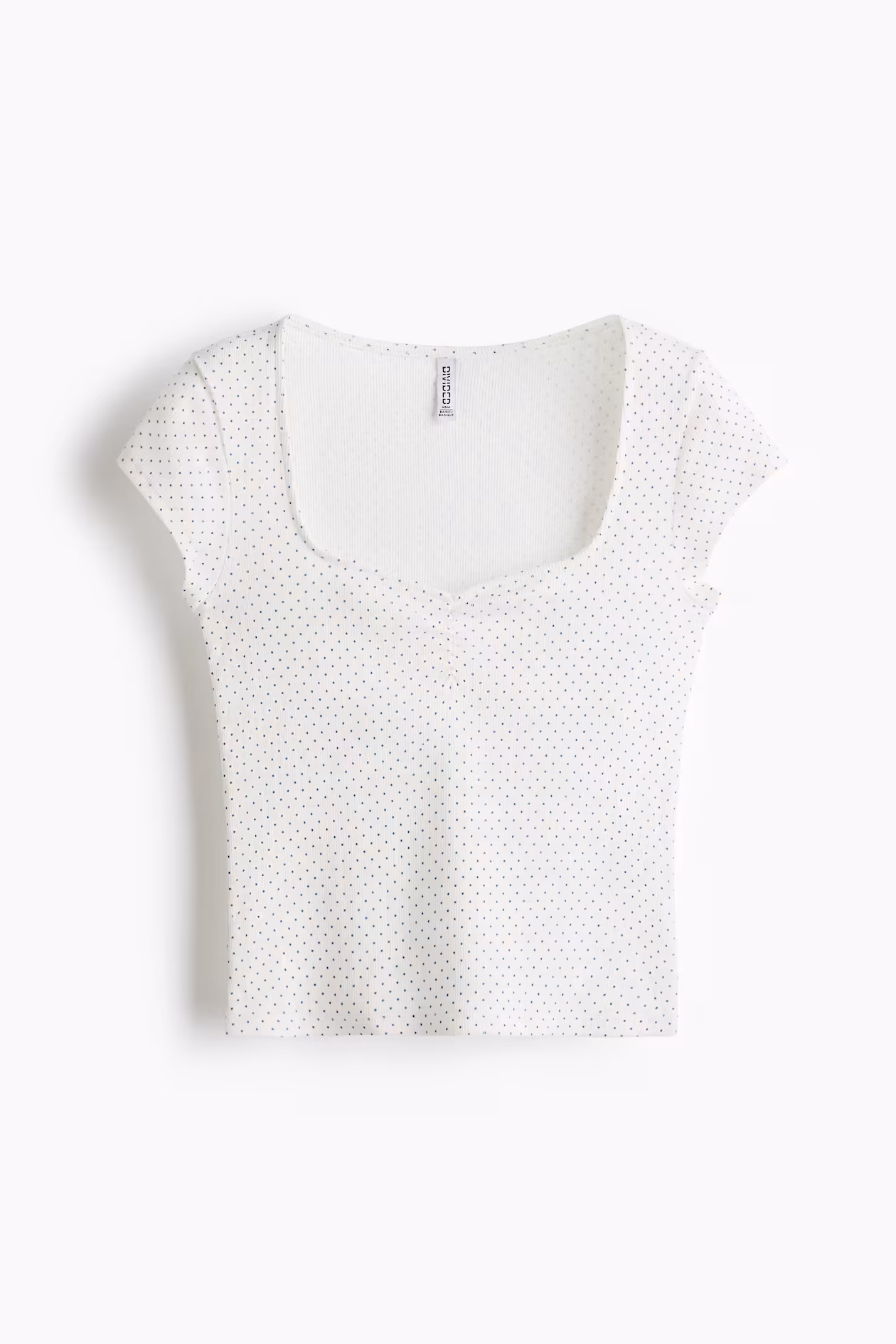 Short, fitted T-shirt in ribbed cotton jersey. Sweetheart neckline, gathered seam at center bust, and a straight-cut hem.