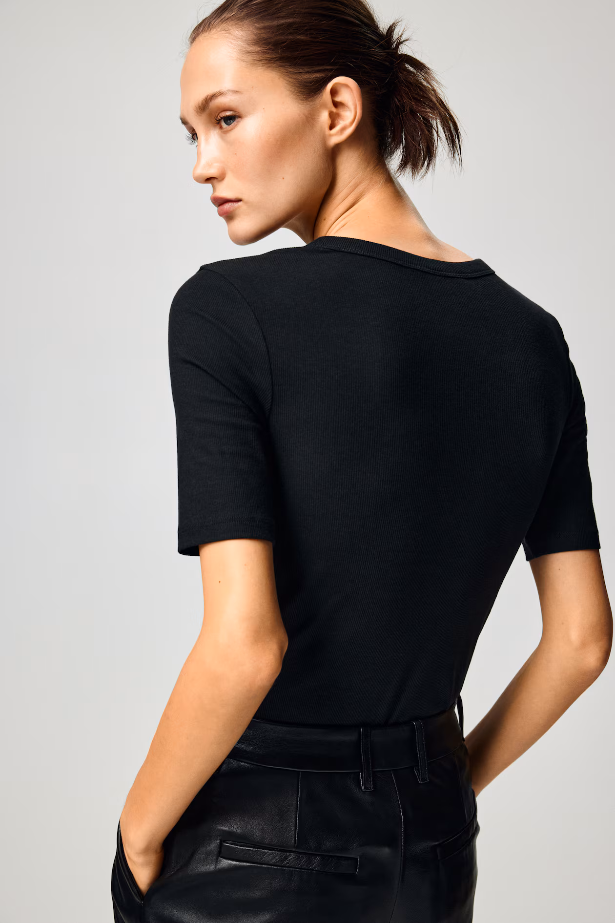 Fitted T-shirt in ribbed jersey made from a cotton and viscose blend. Ribbed round neckline and a straight-cut hem.