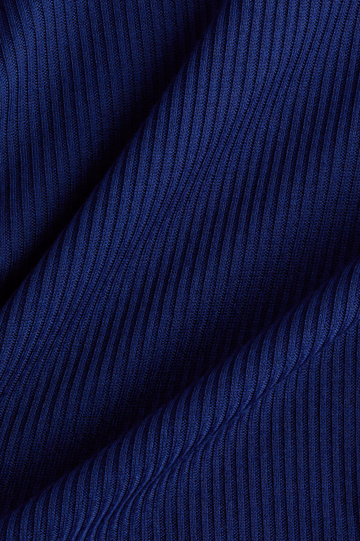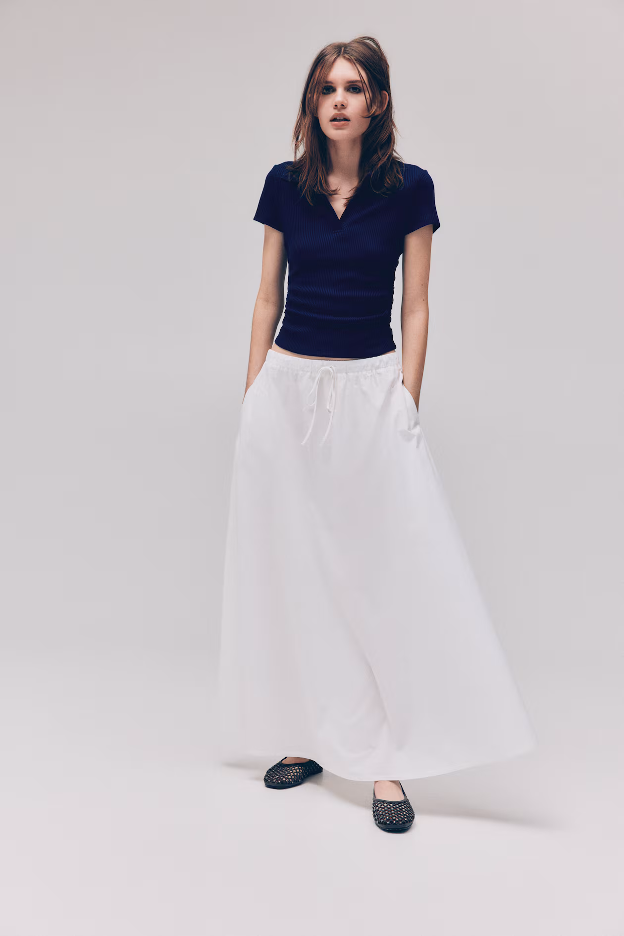 Short-sleeved top in ribbed jersey. Open collar and gathers at sides of waist.
