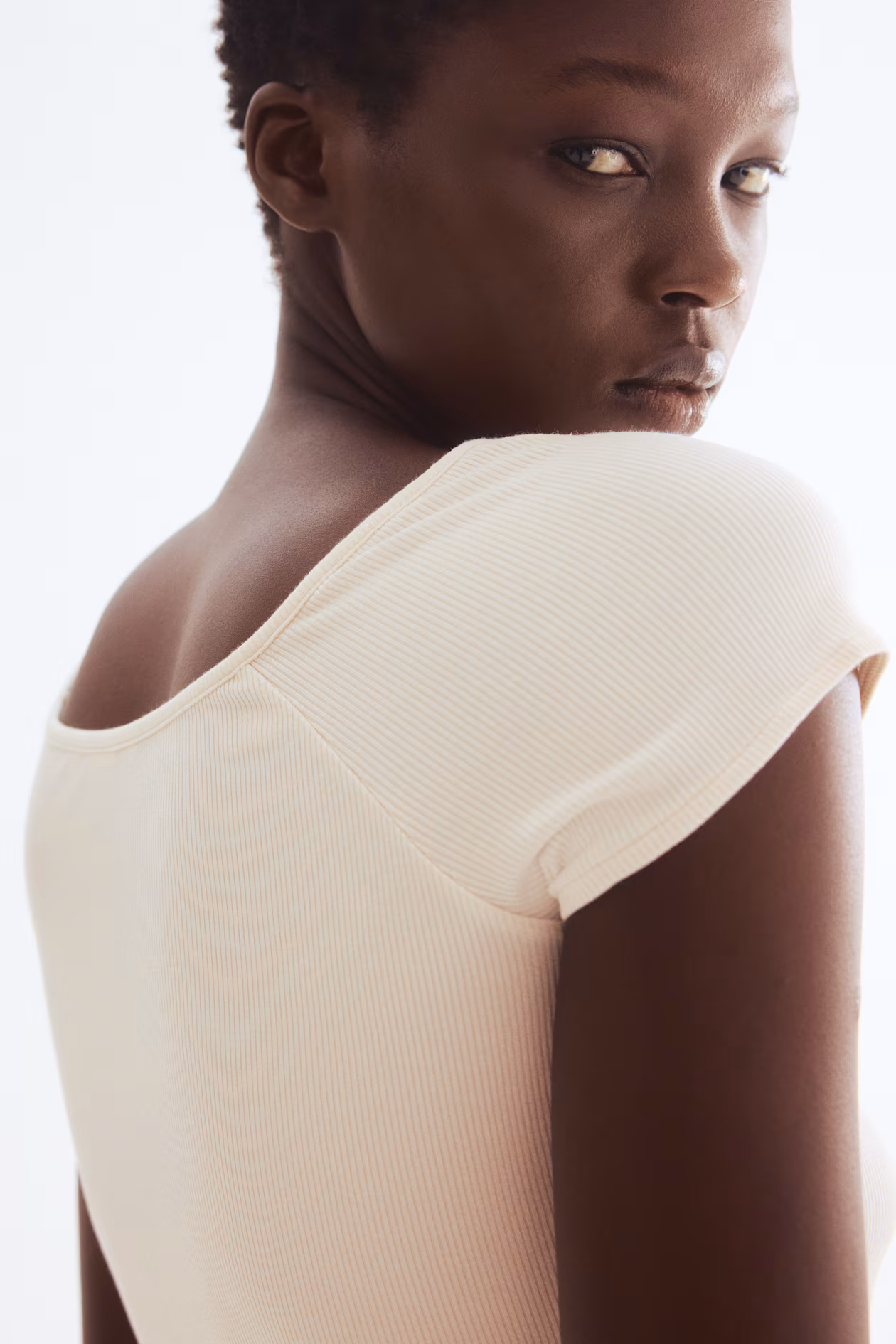 Fitted top in ribbed viscose jersey. Ballerina neckline and short raglan sleeves.