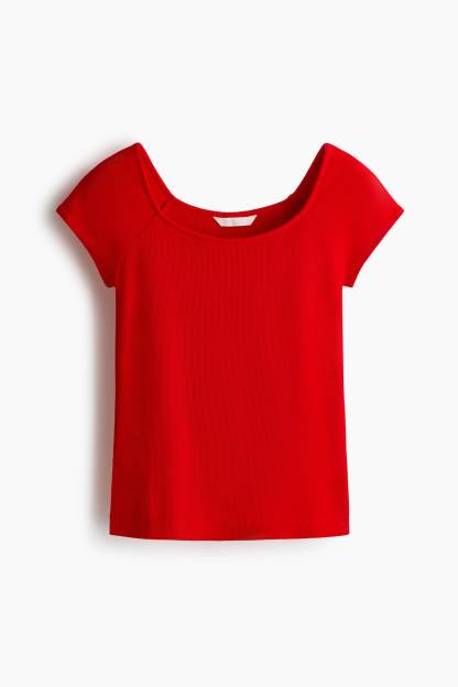 Fitted top in ribbed viscose jersey. Ballerina neckline and short raglan sleeves.