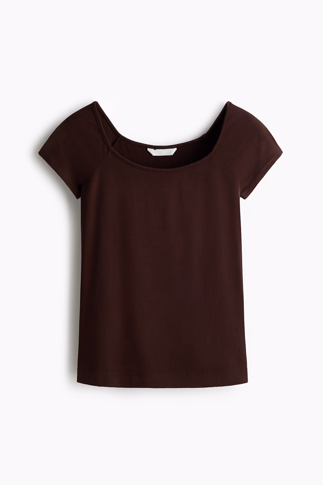 Fitted top in ribbed viscose jersey. Ballerina neckline and short raglan sleeves.