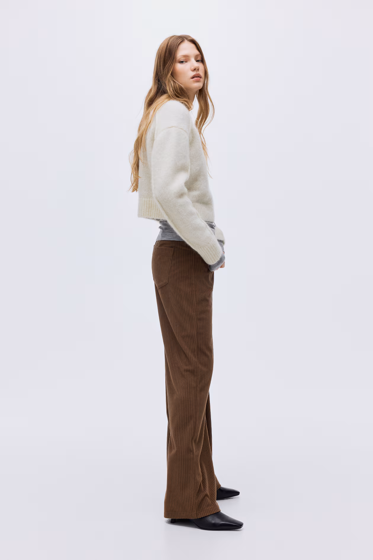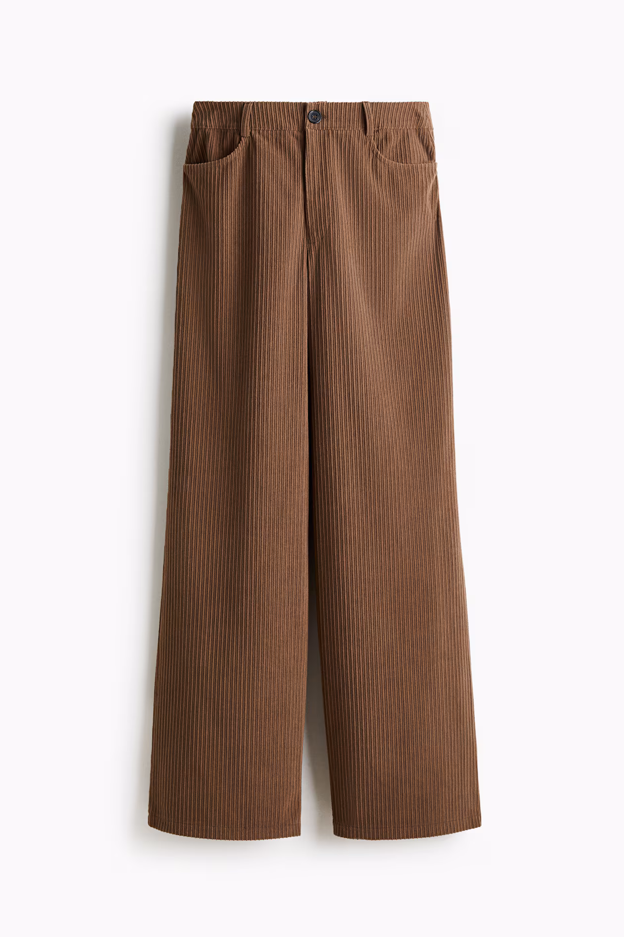 Pants in ribbed velour. Zip fly with button, front pockets, and back pockets. Wide legs.