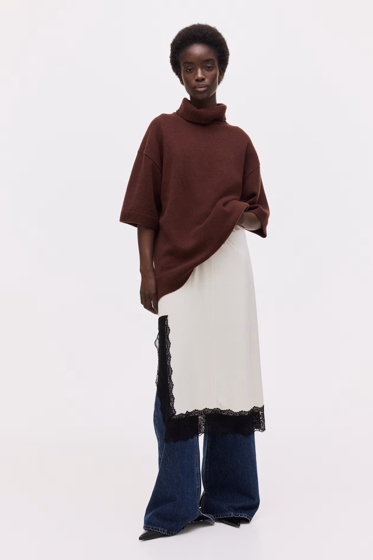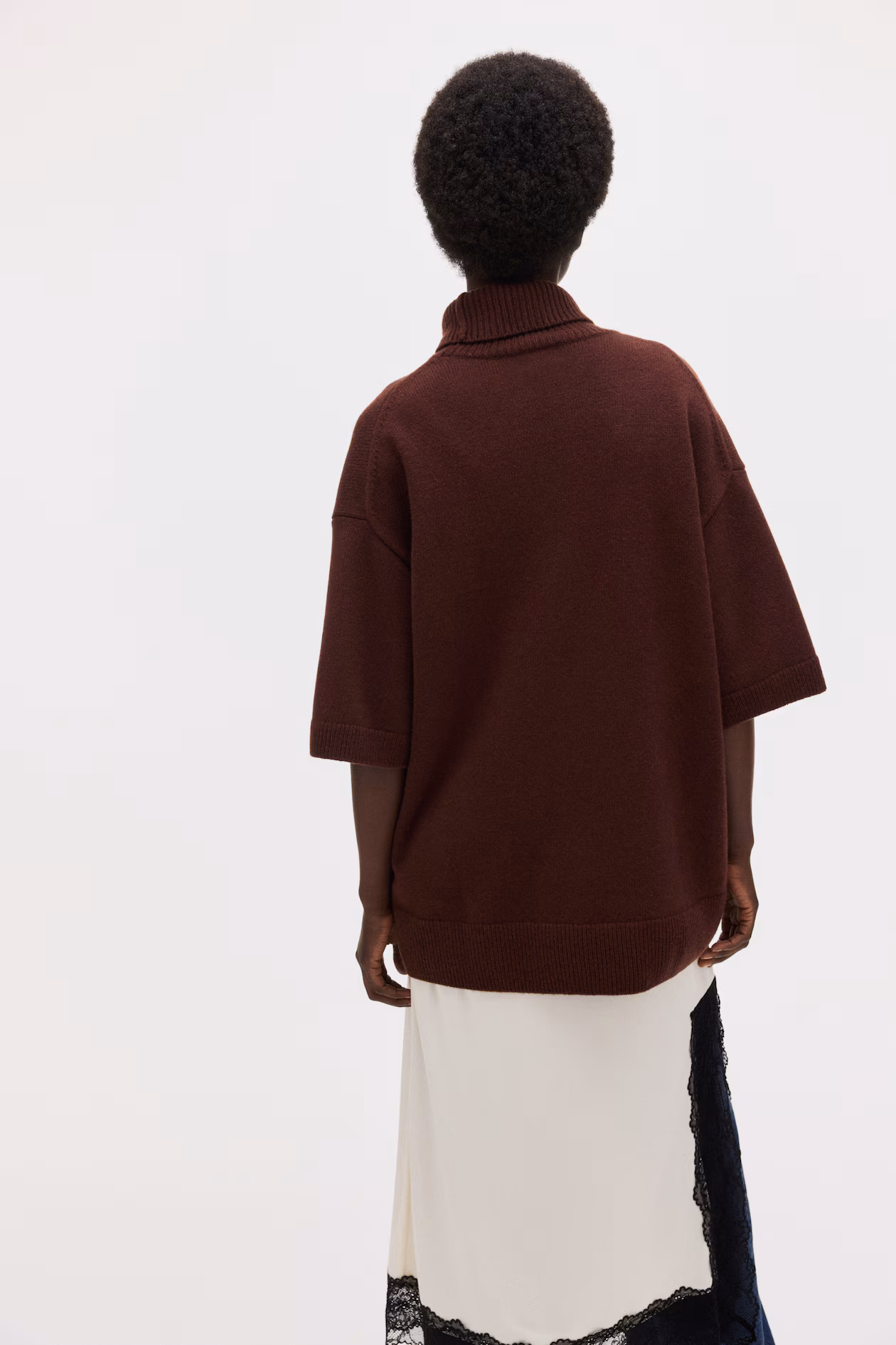Long, oversized sweater in fine-knit wool. Roll neck, heavily dropped shoulders, and elbow-length sleeves. Ribbing at neck, cuffs, and hem.