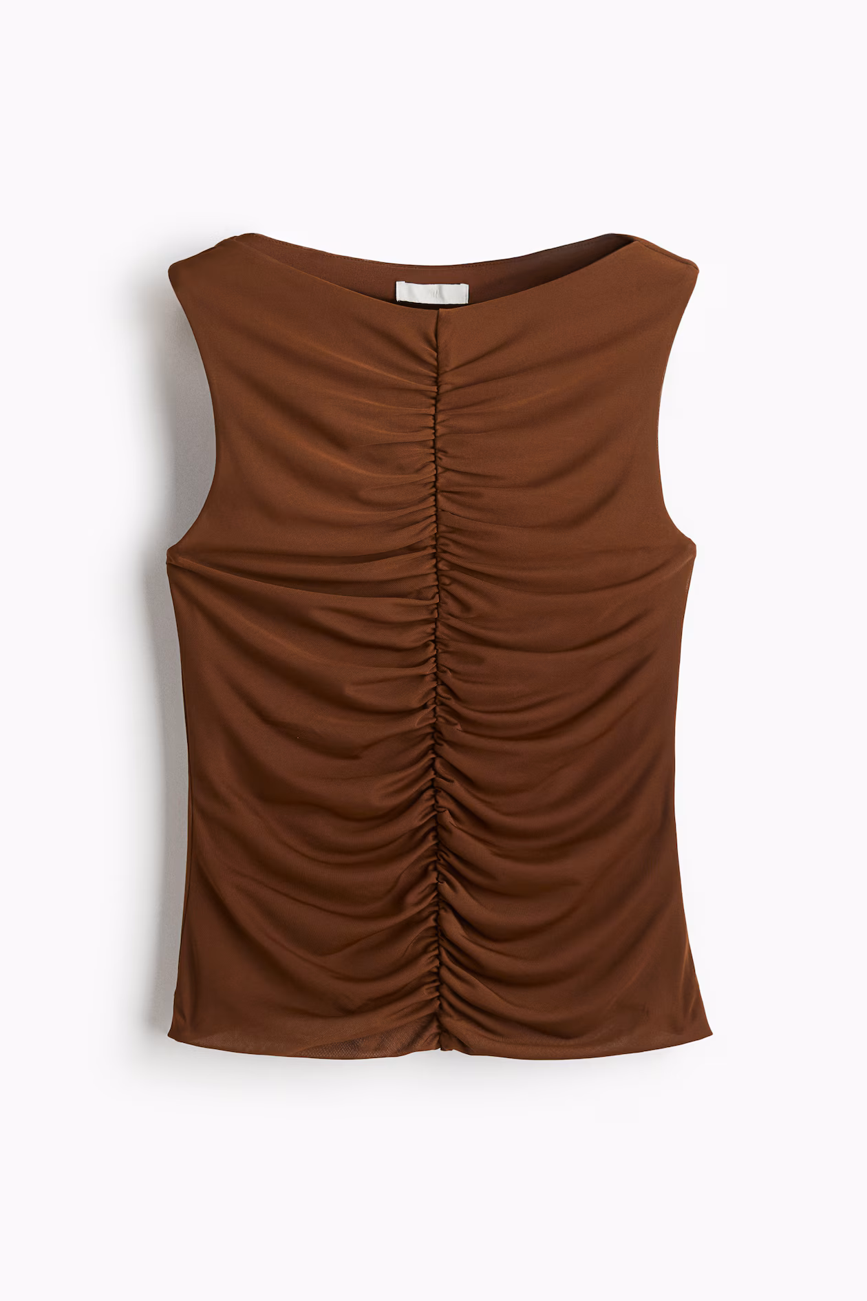 Fitted, sleeveless top in crêpe jersey with an elegant boat neck. Vertical, ruched seam full length of front for a draped effect. Jersey lining.