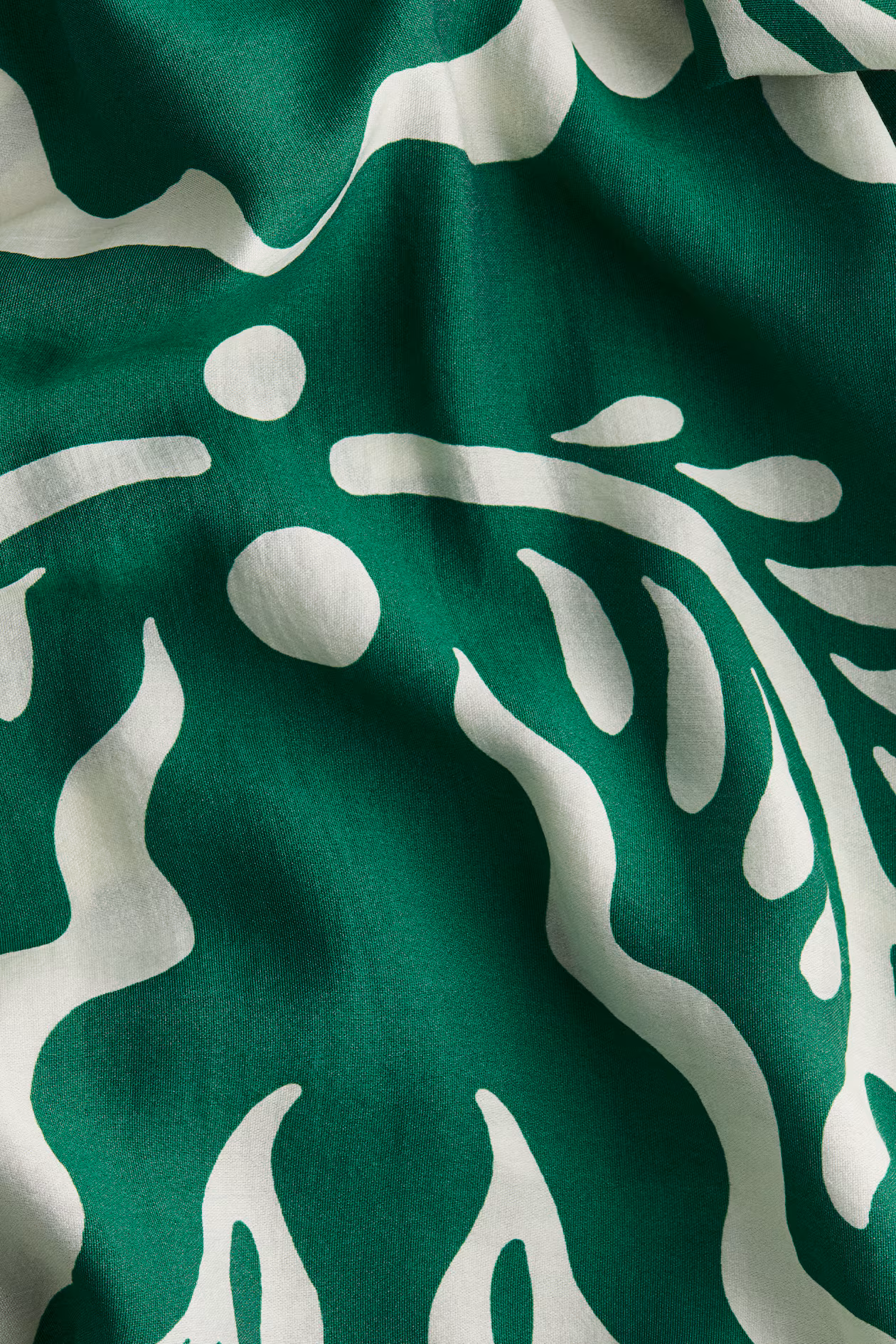 Loose-fit dress in woven fabric. Ruffled stand-up collar, V-shaped opening at front with extra-narrow ties, long raglan balloon sleeves, and smocked, ruffle-trimmed cuffs. Gathered seam above knees for added volume. Unlined.
