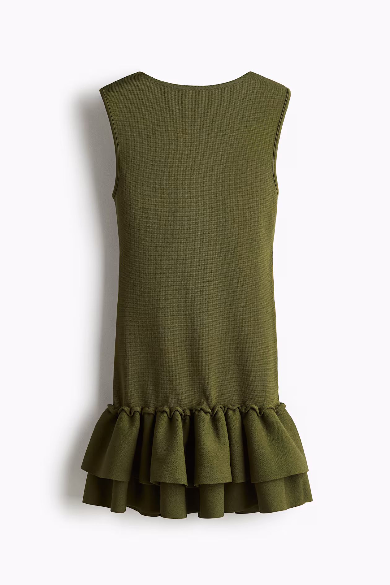 Short, fitted, sleeveless dress in densely knit fabric with a boat neck. Double ruffle at hem.