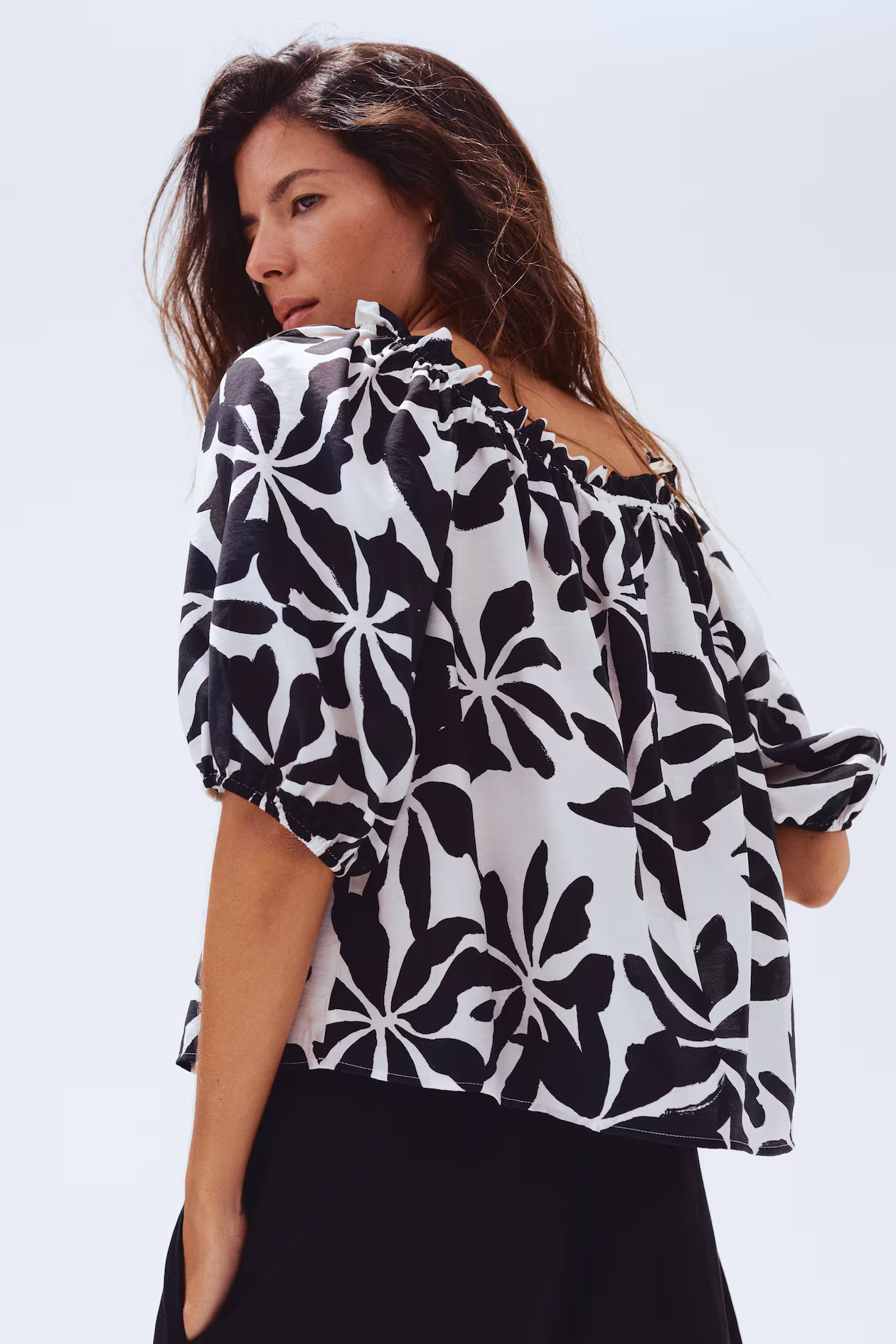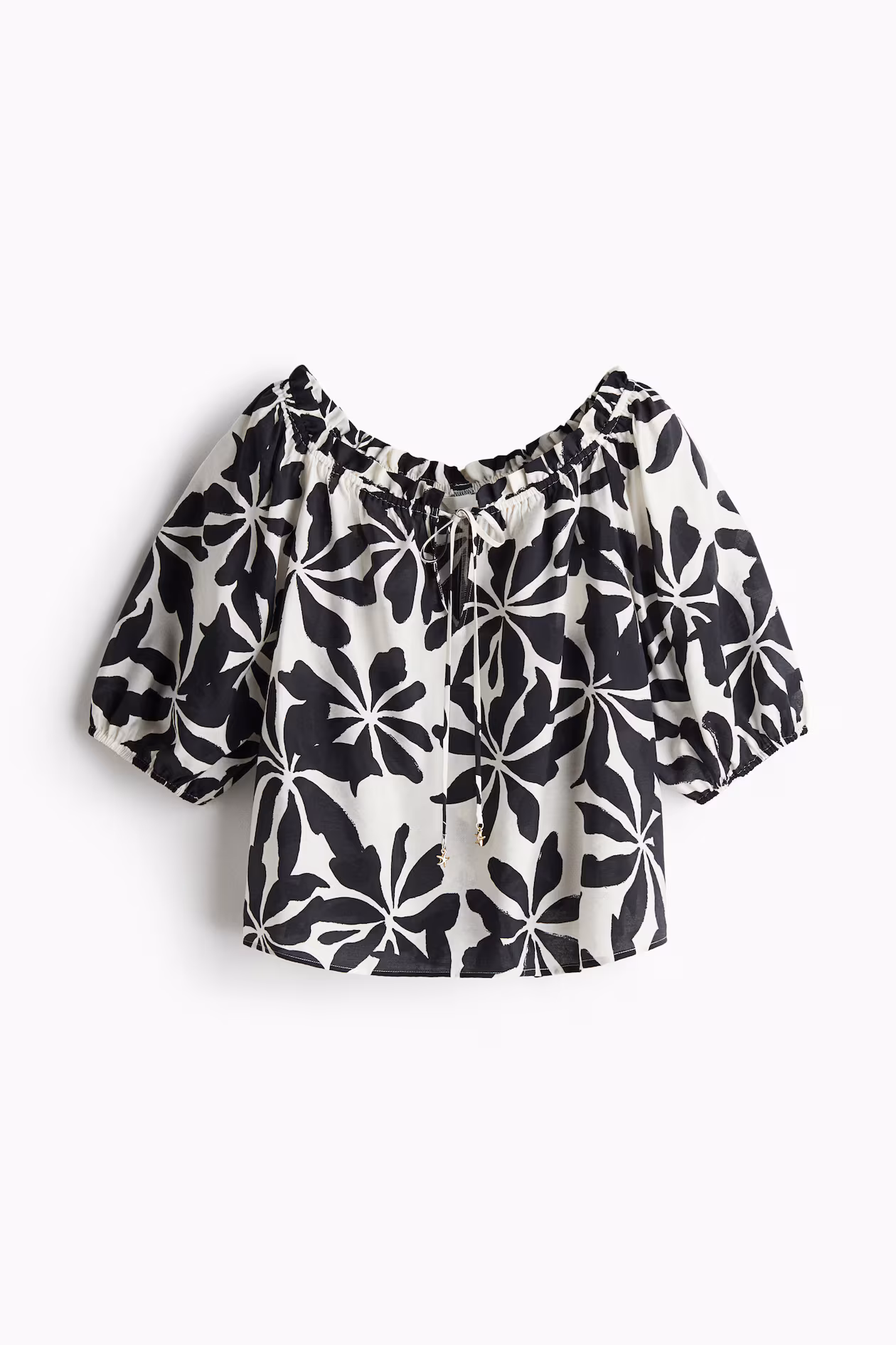 Short, loose-fit blouse in woven fabric. Elasticized, ruffle-trimmed neckline, opening at front with extra-narrow ties with metal pendants at ends, and short, raglan balloon sleeves with narrow elastic at cuffs.