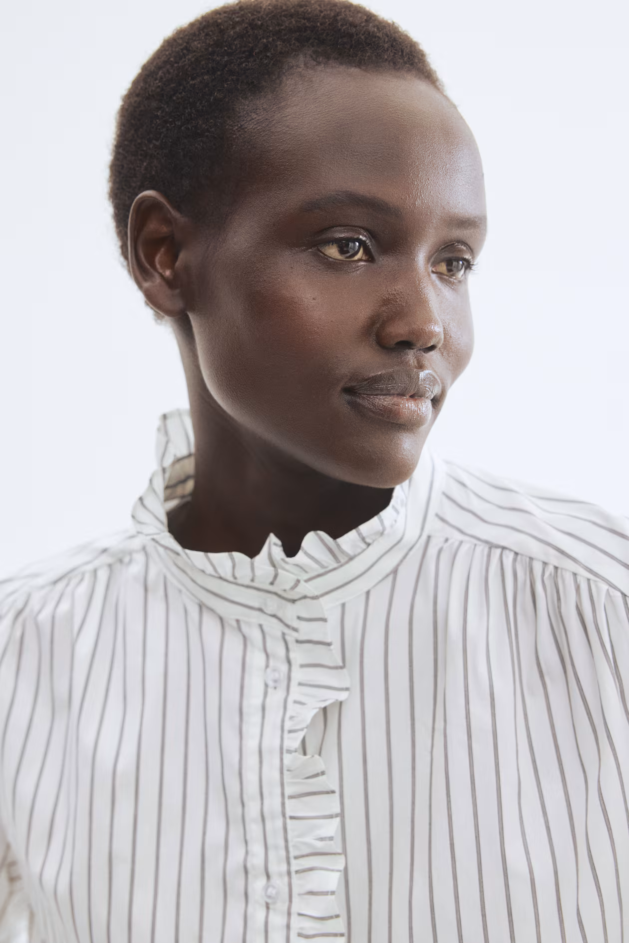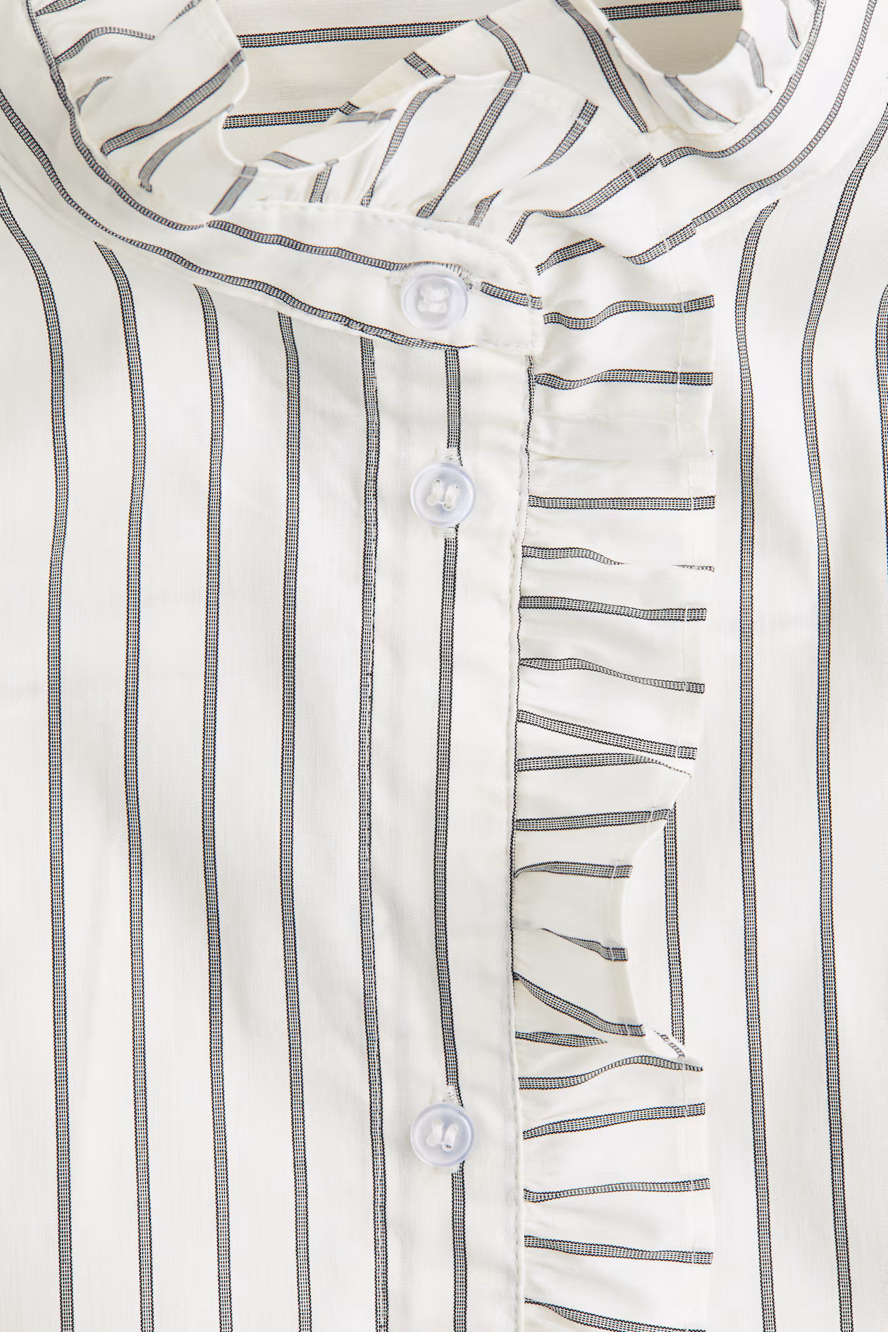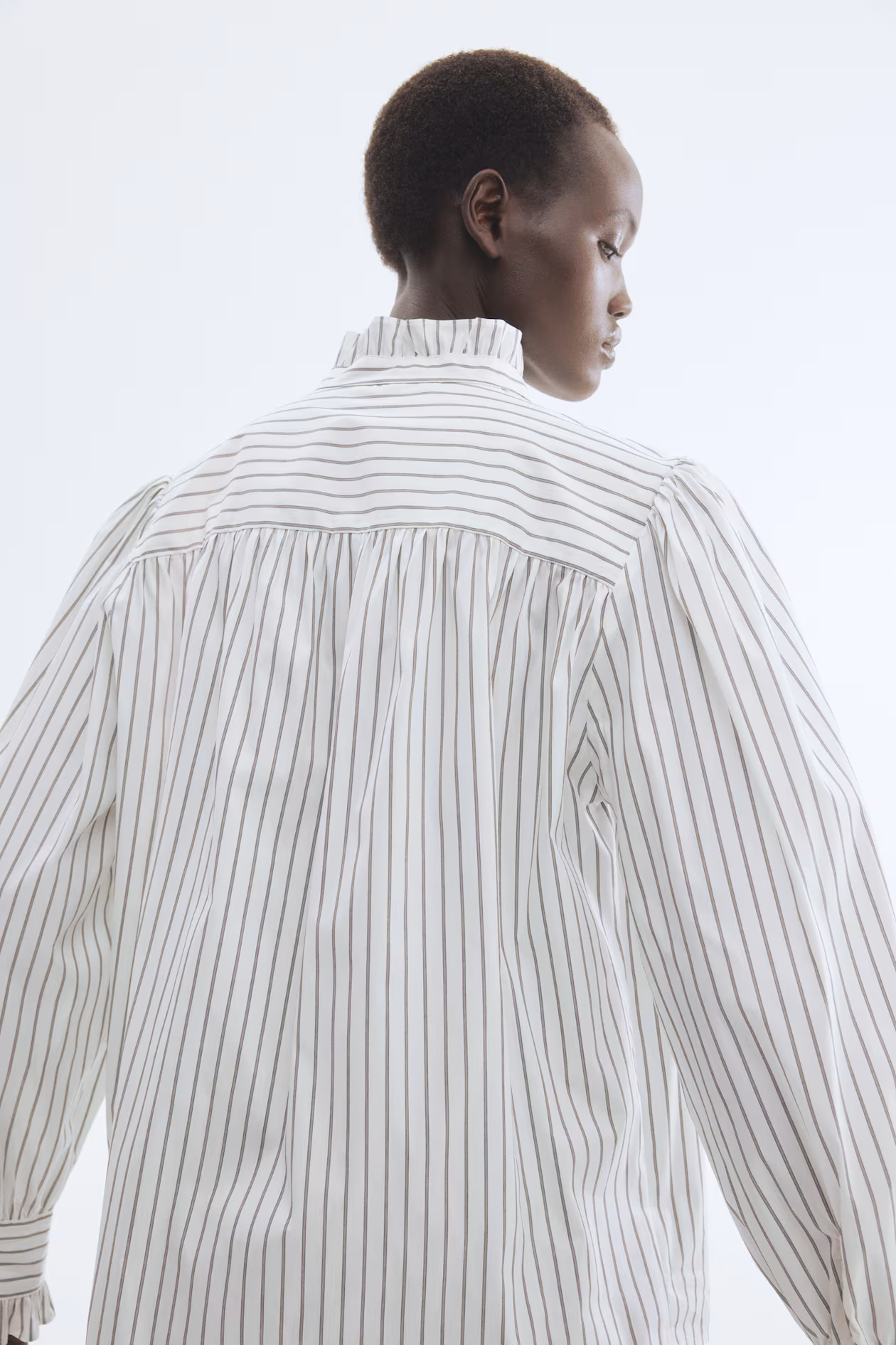 Loose-fit blouse in woven fabric. Stand-up collar, button placket, and yoke at back with gathers. Forward-facing shoulder seams with gathers, long balloon sleeves with button at cuffs, and ruffle trim at collar, placket, and cuffs. Rounded hem.