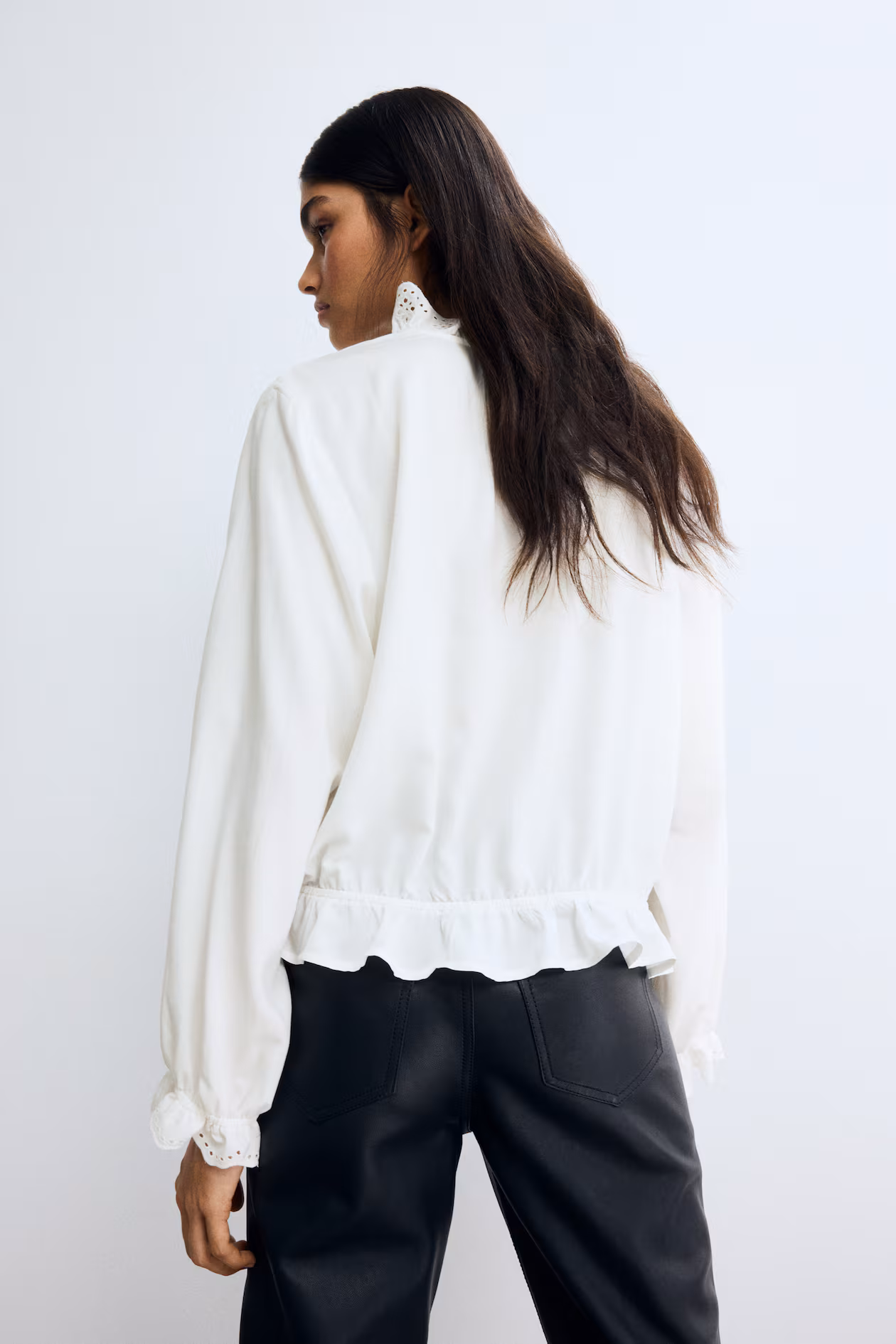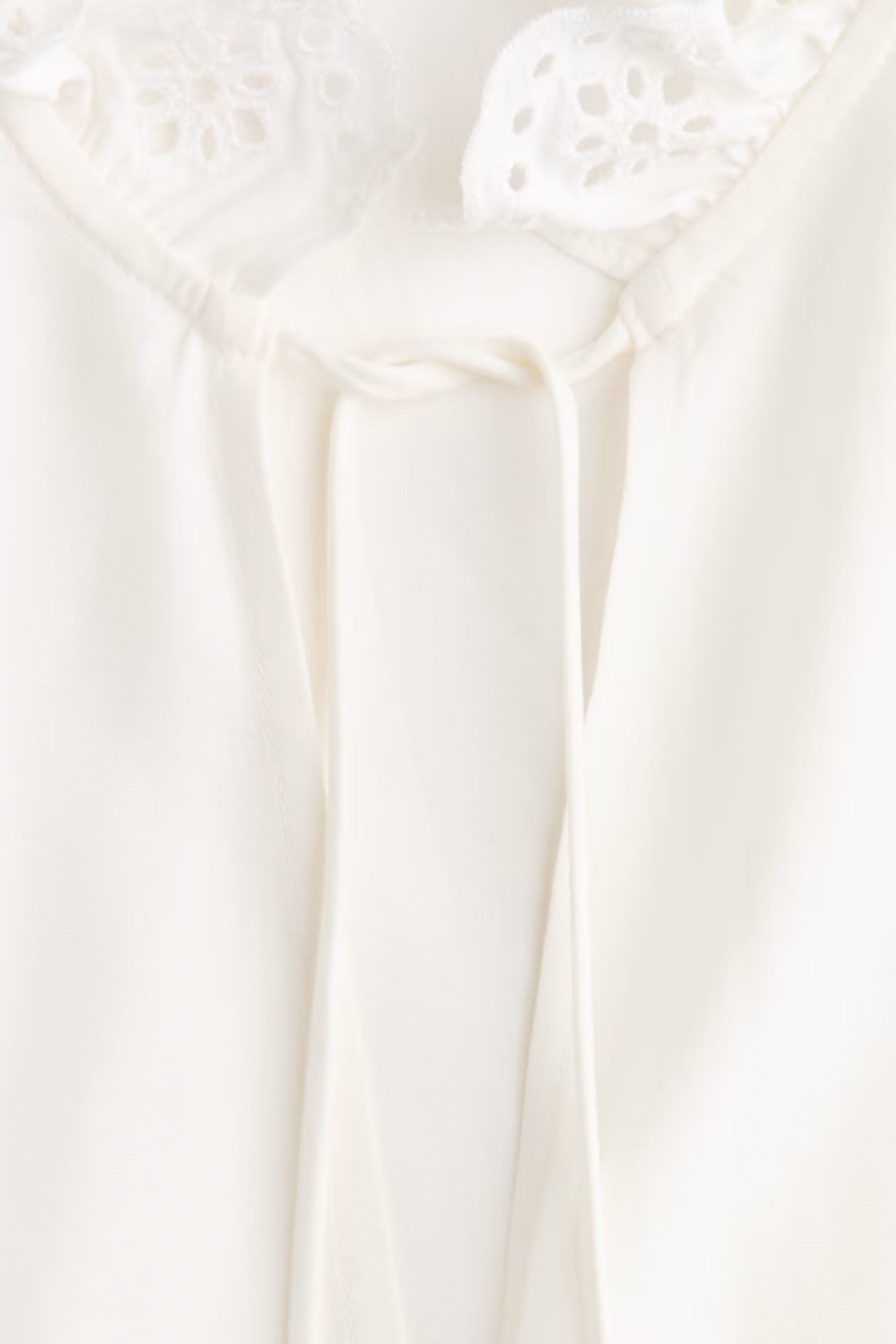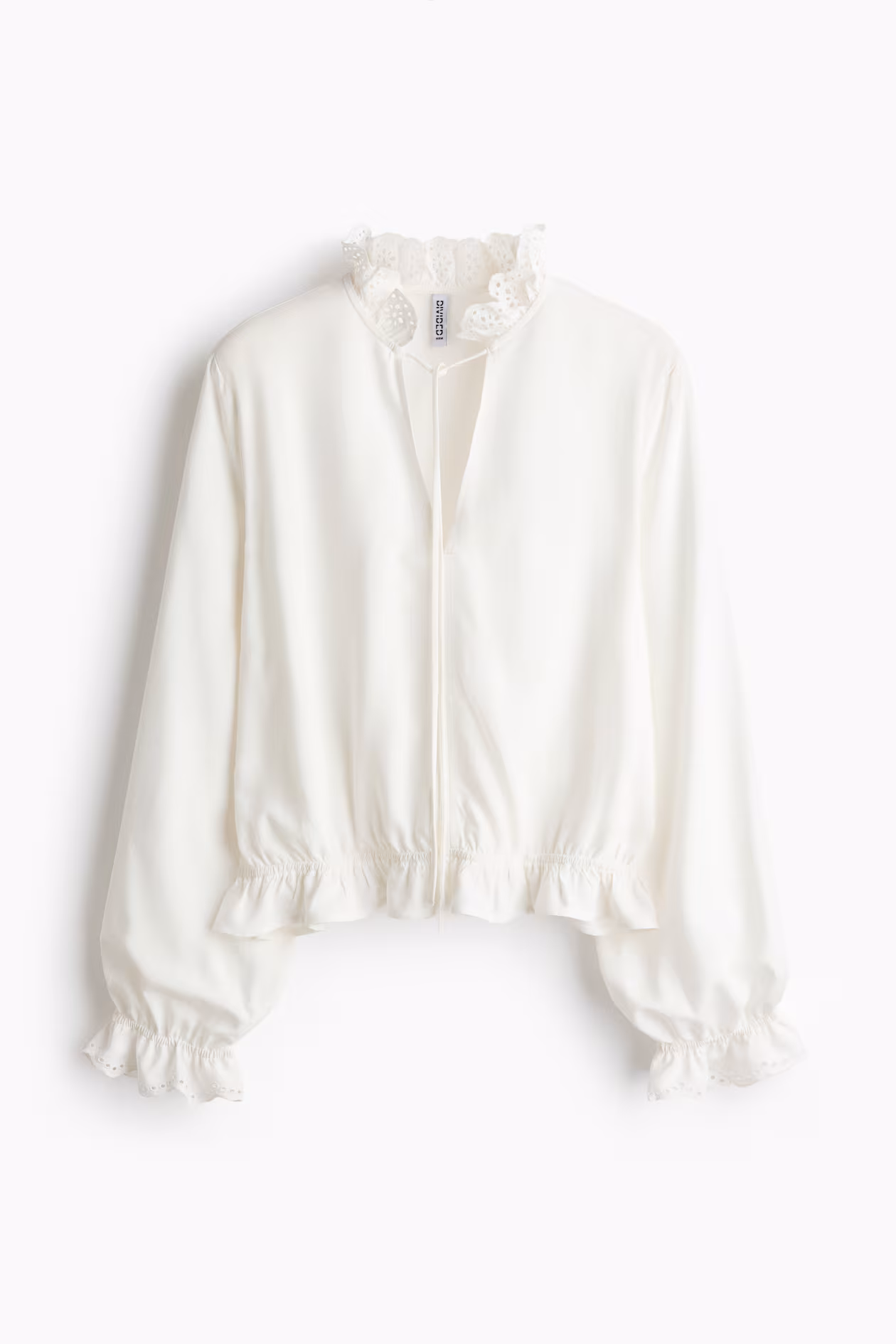 Blouse in woven viscose with eyelet-embroidered details. Ruffle collar, V-shaped opening at front with narrow ties, and long balloon sleeves. Ruffle trim at cuffs and hem.