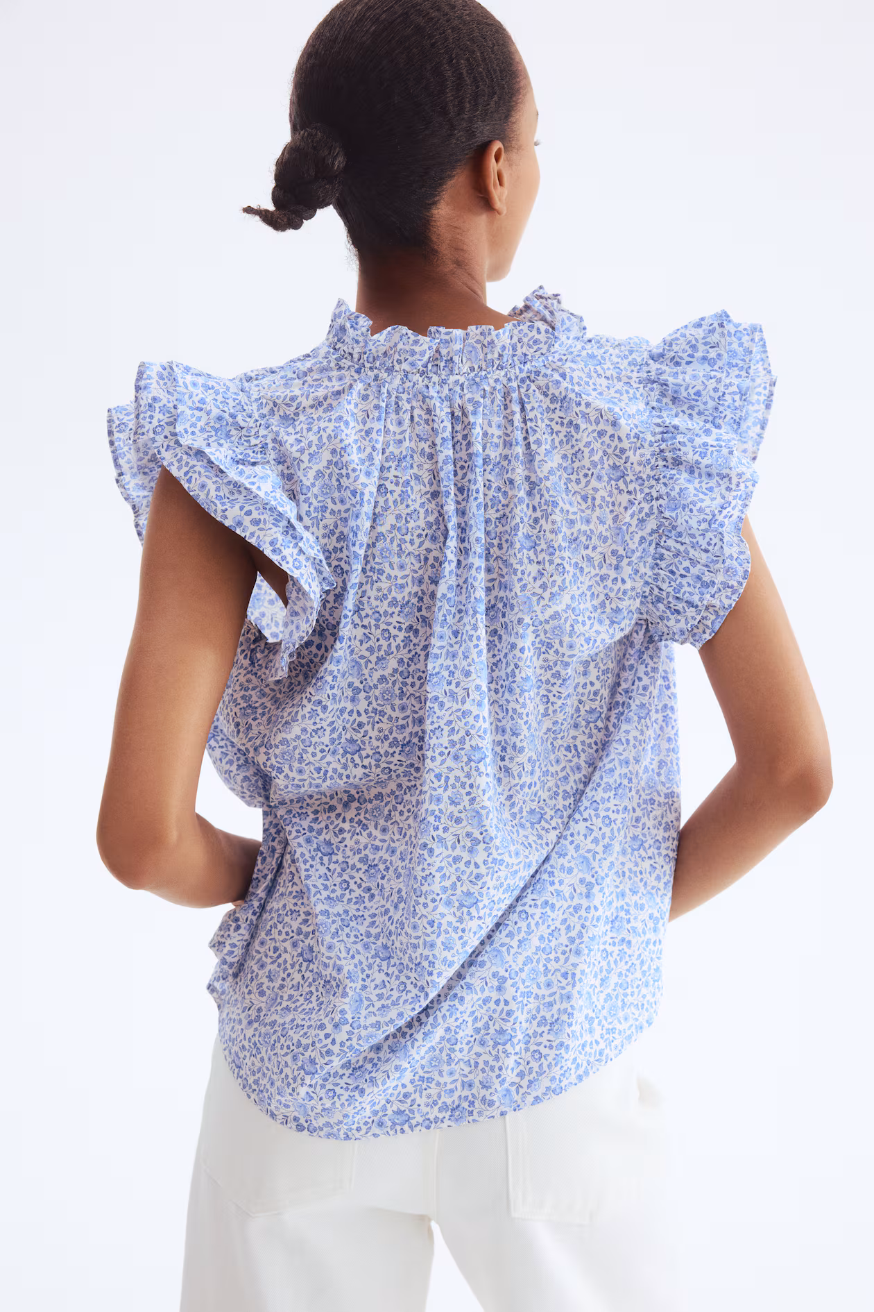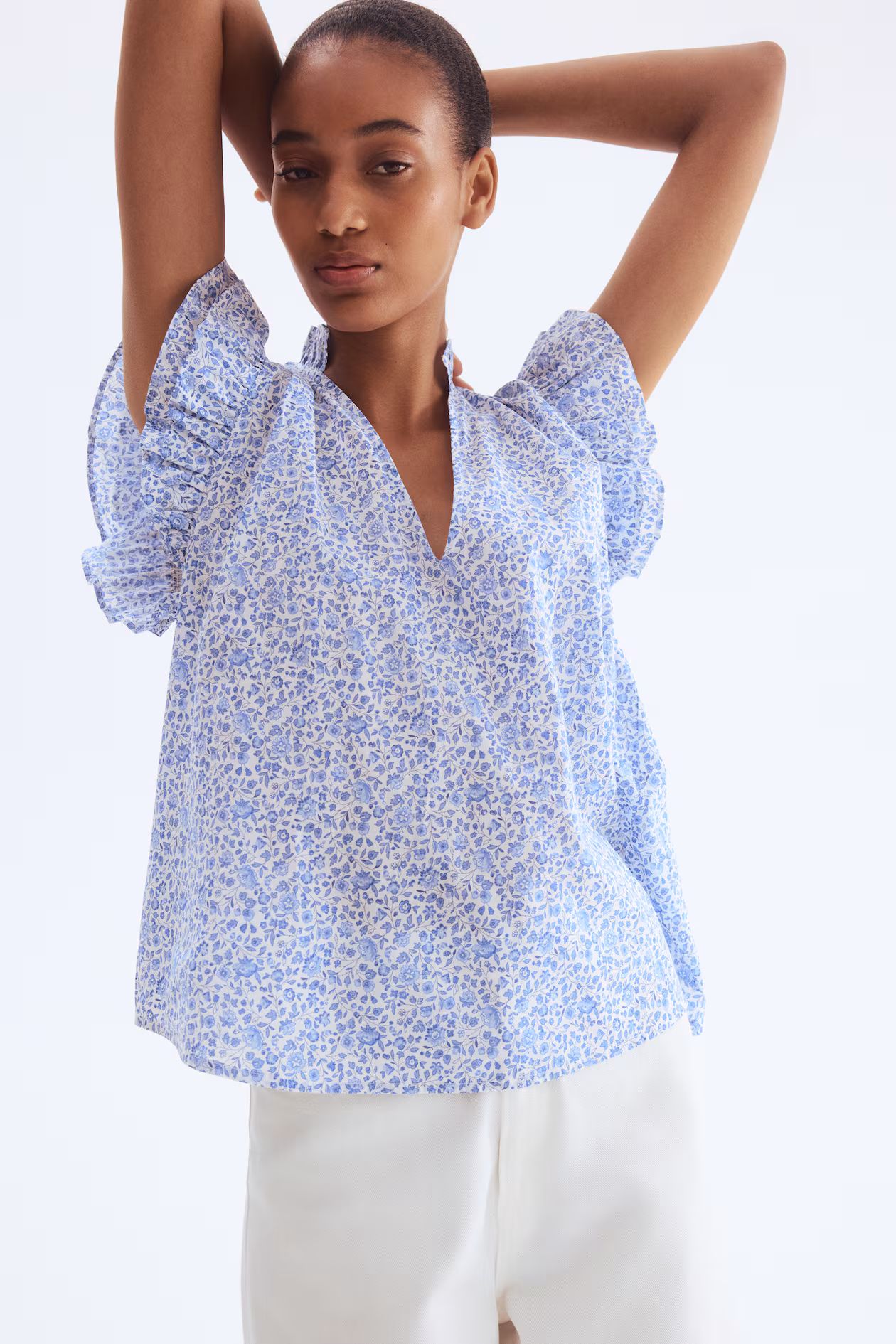 Blouse in woven cotton. Ruffled collar, low-cut V-neck, and gathers at back of neck for a gently draped effect. Gathered shoulder seams and double-layered flutter sleeves.