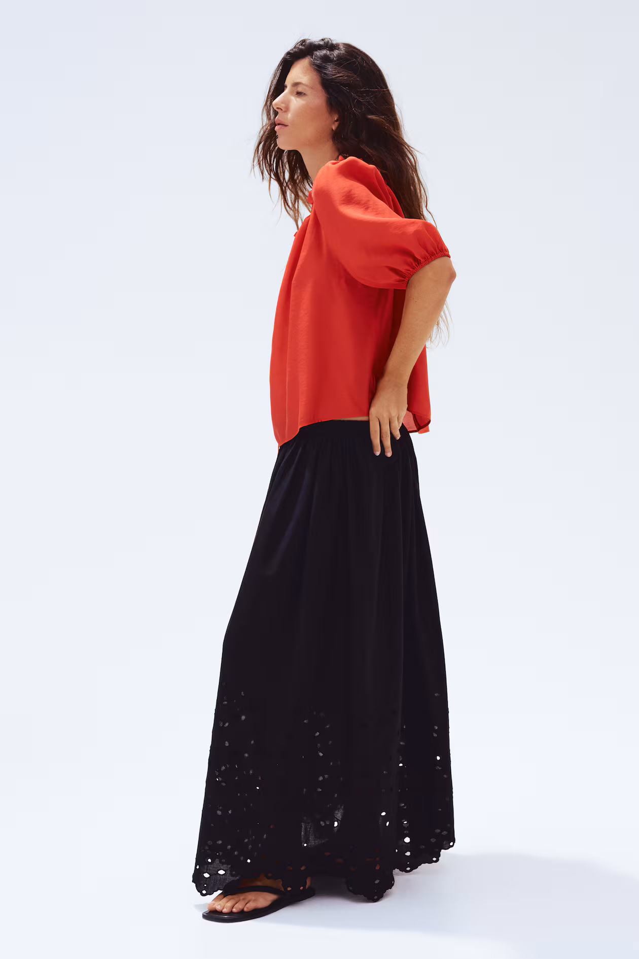 Short, loose-fit blouse in woven fabric. Elasticized, ruffle-trimmed neckline, opening at front with extra-narrow ties with metal pendants at ends, and short, raglan balloon sleeves with narrow elastic at cuffs.