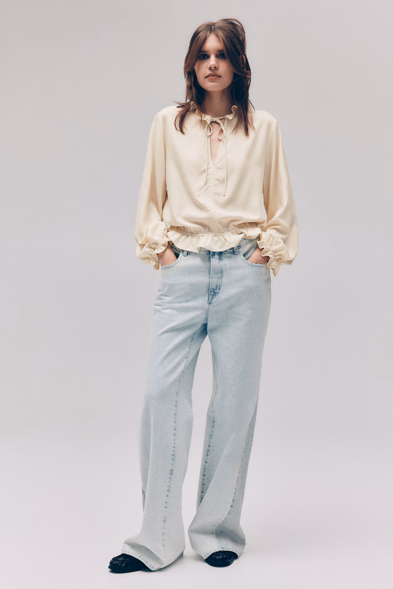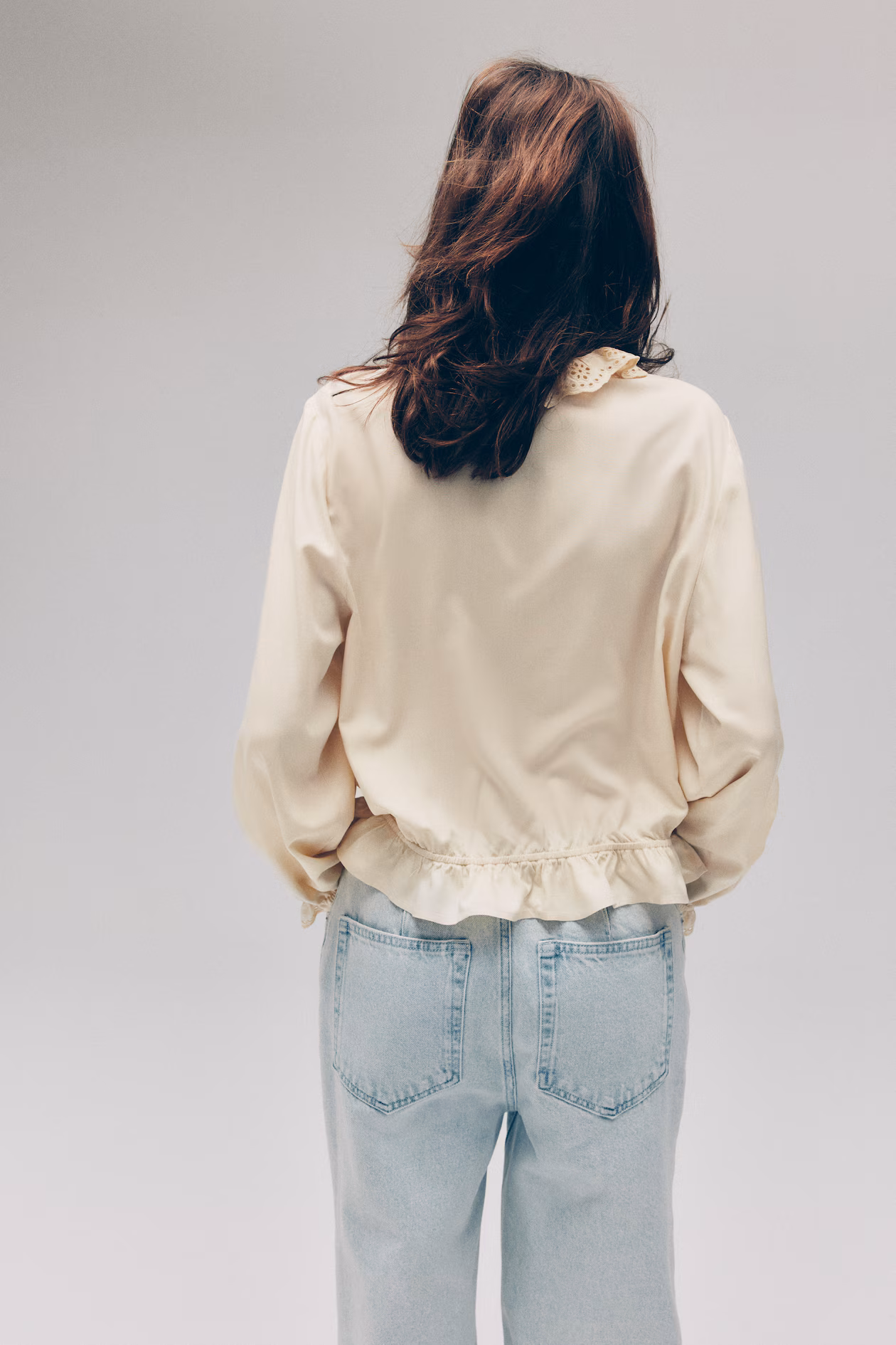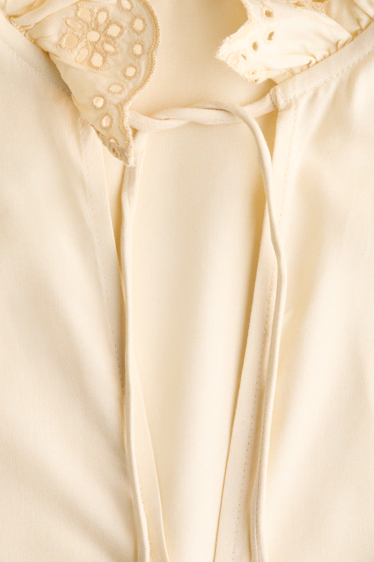 Blouse in woven viscose with eyelet-embroidered details. Ruffle collar, V-shaped opening at front with narrow ties, and long balloon sleeves. Ruffle trim at cuffs and hem.