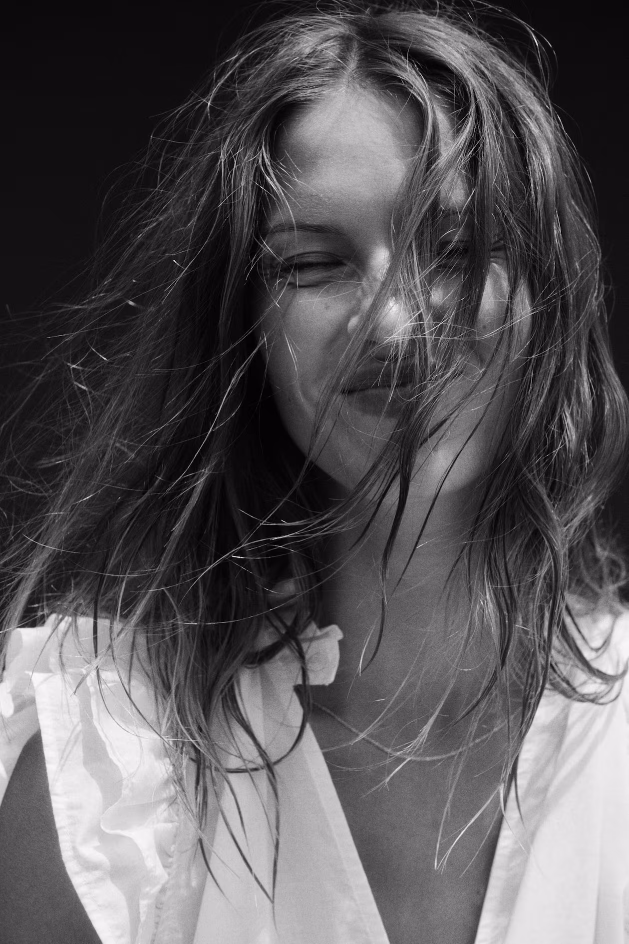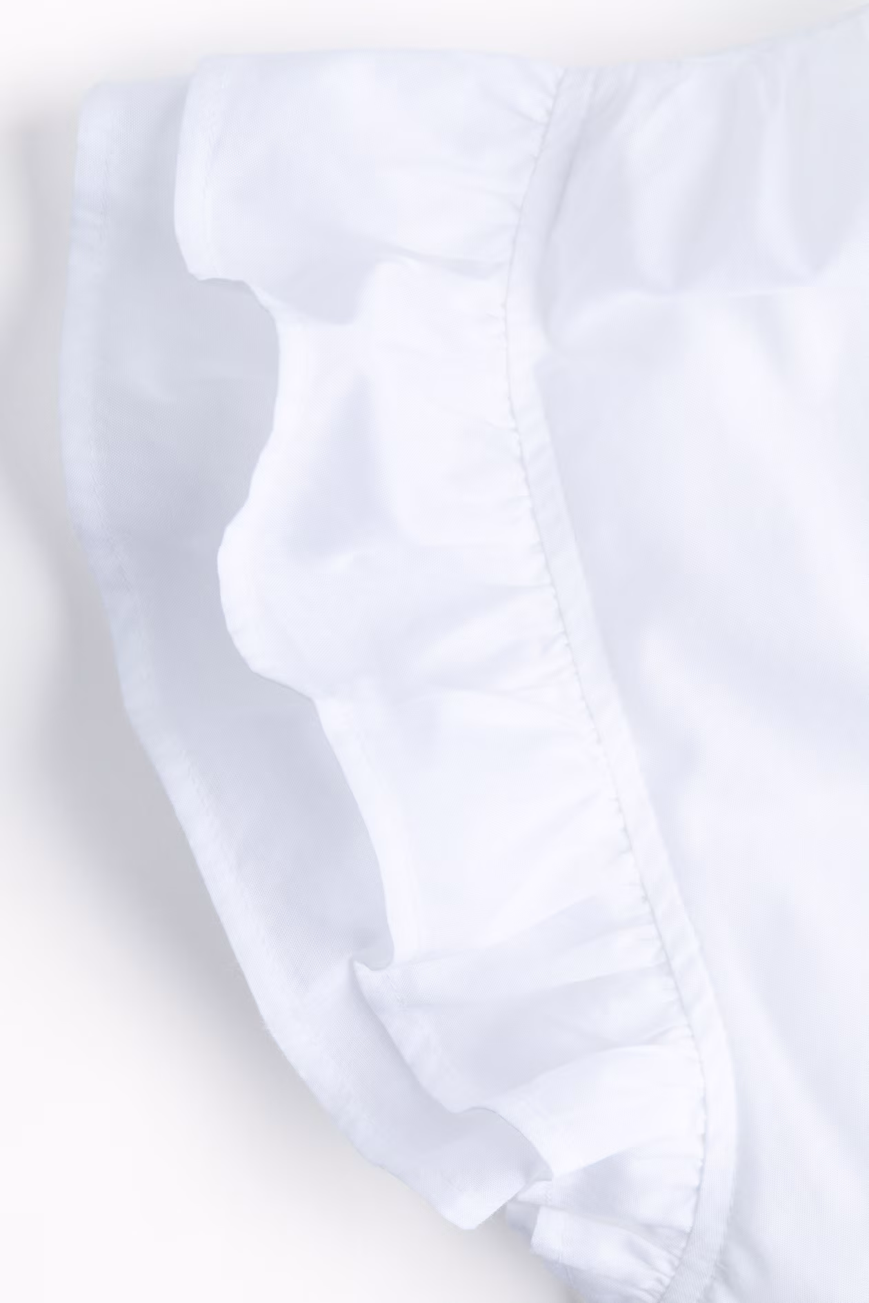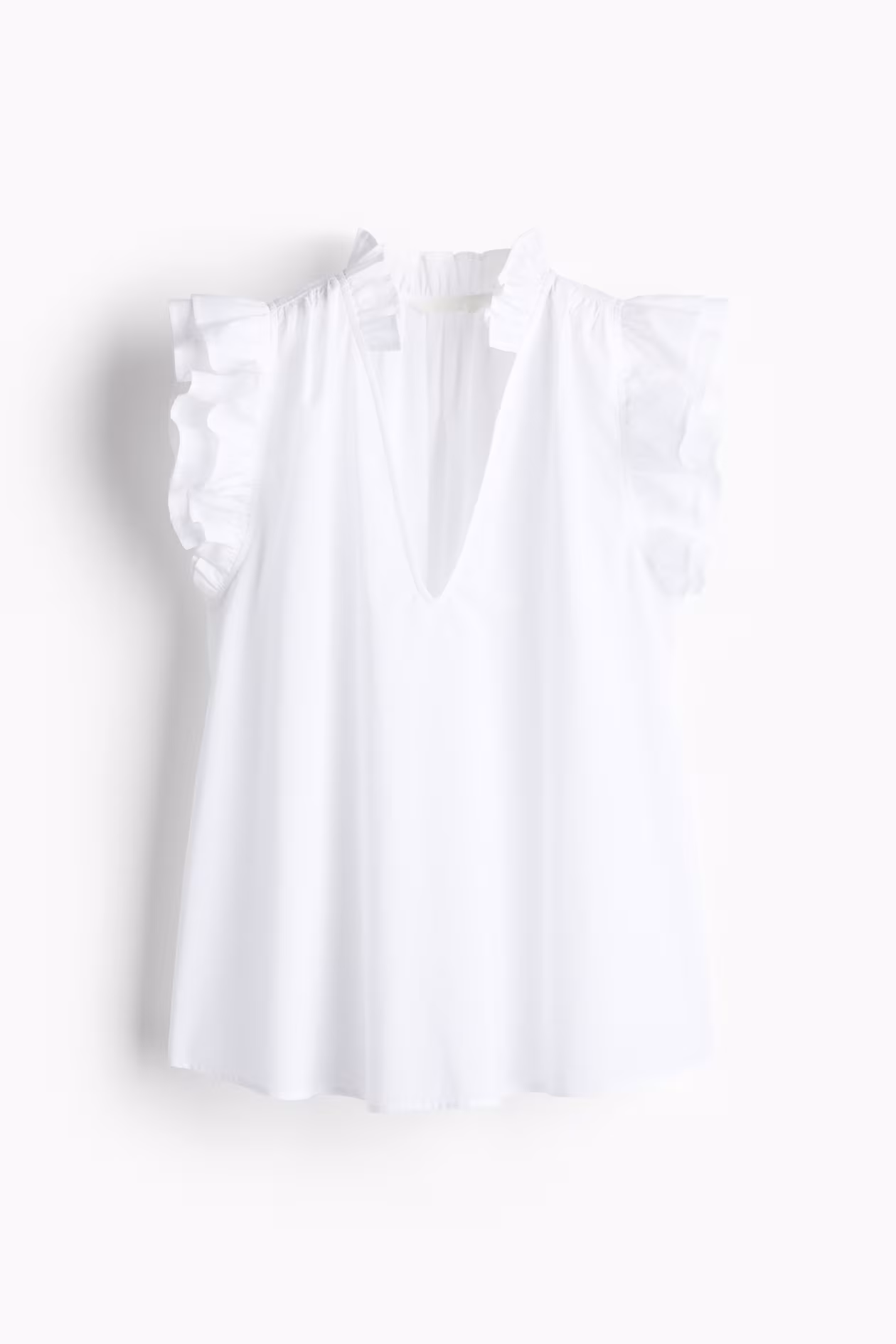 Blouse in woven cotton. Ruffled collar, low-cut V-neck, and gathers at back of neck for a gently draped effect. Gathered shoulder seams and double-layered flutter sleeves.