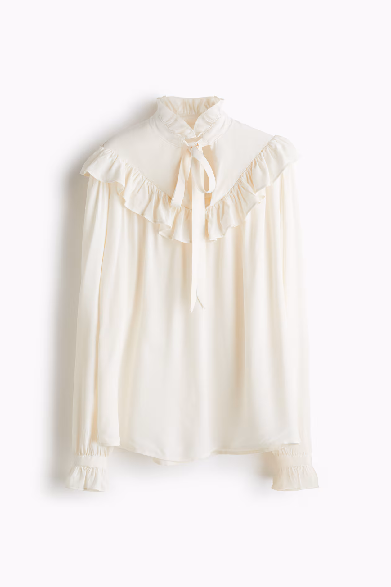 Blouse in woven crêpe fabric. Collar, opening at front with long ties, and V-shaped, double-layered yoke at front and back. Long balloon sleeves with button at cuffs. Ruffle at collar, yoke, and cuffs. Gently rounded hem.