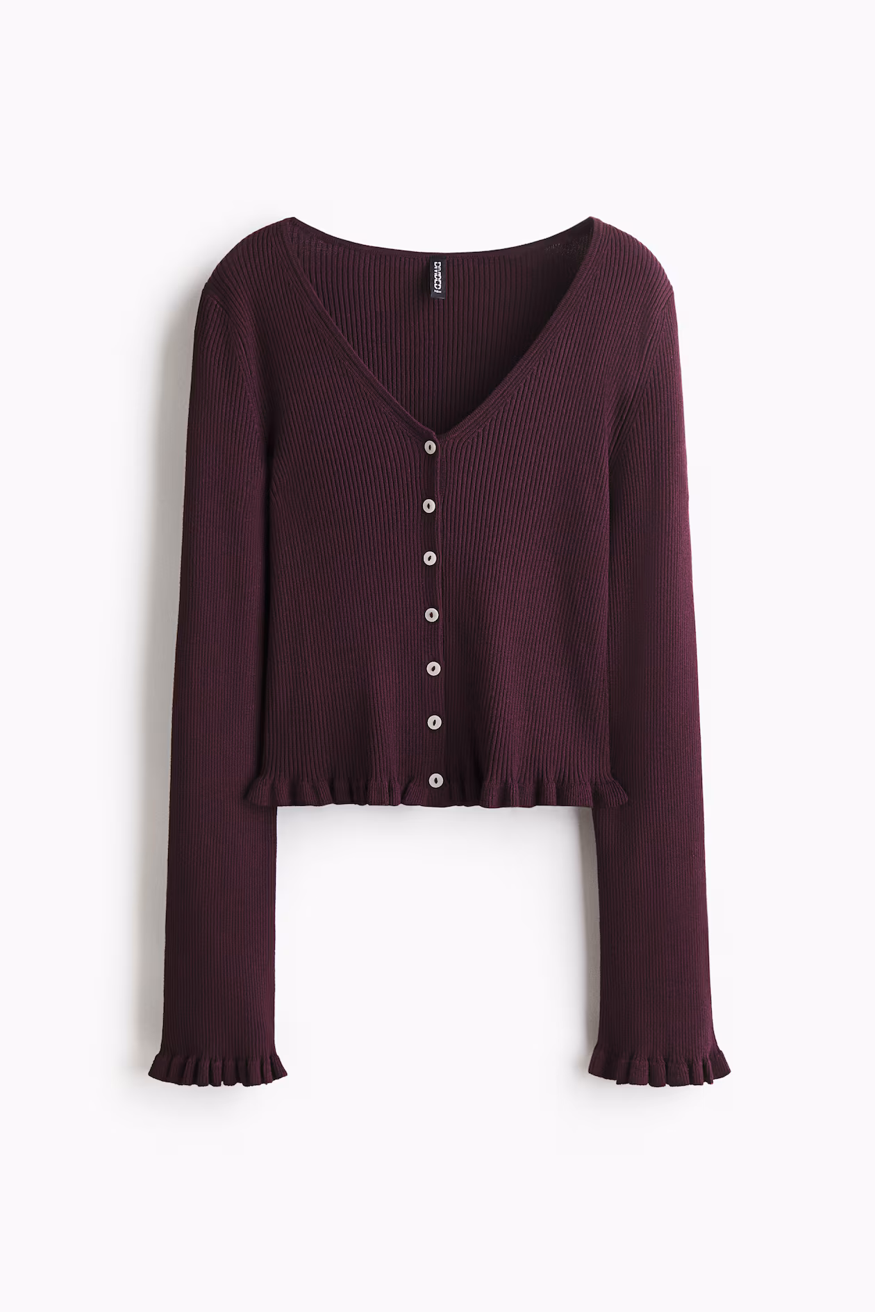 Short, slim-fit cardigan in a soft rib knit. V-neck, buttons at front, and long sleeves. Ruffle trim at cuffs and hem.
