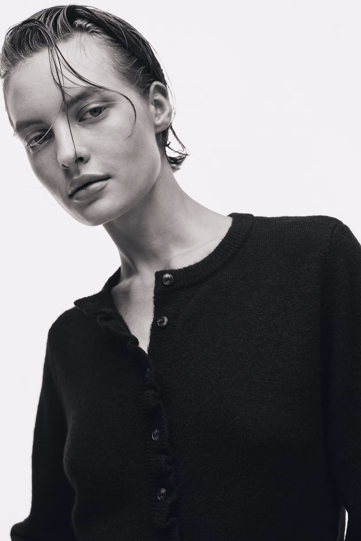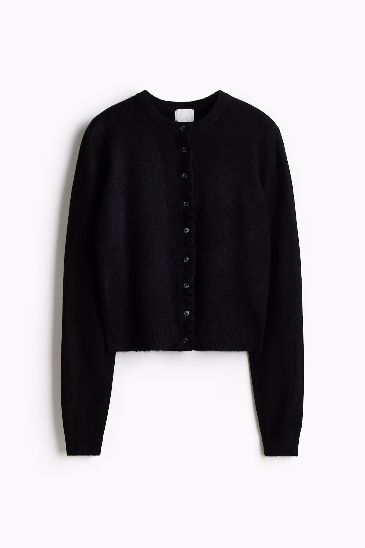 Soft, fine-knit cardigan with wool content. Round neckline, ruffle-trimmed button placket, and ribbing at neckline, cuffs, and hem.