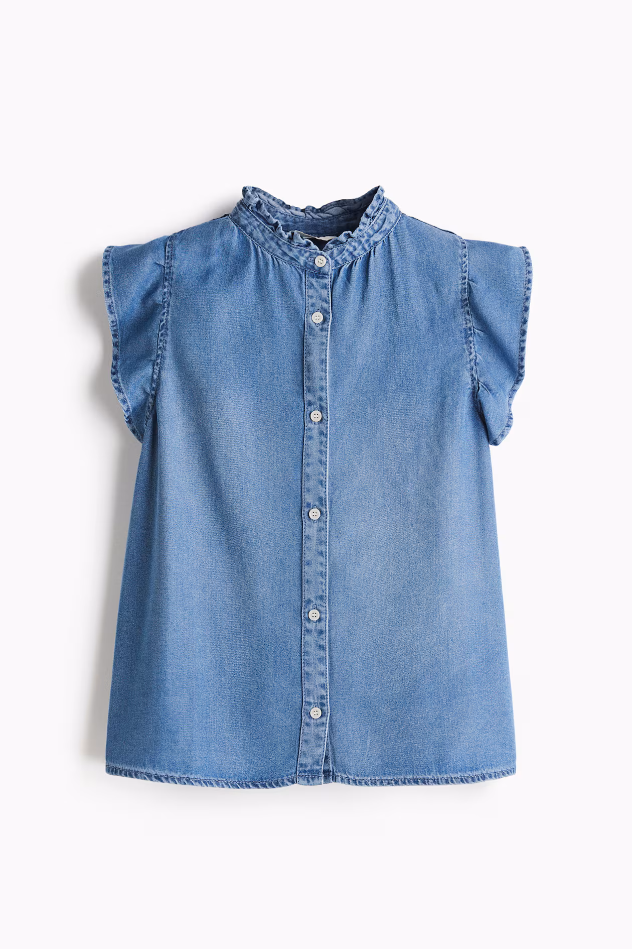 Blouse in lightweight lyocell denim. Ruffle-trimmed collar, buttons at front, and flutter sleeves.