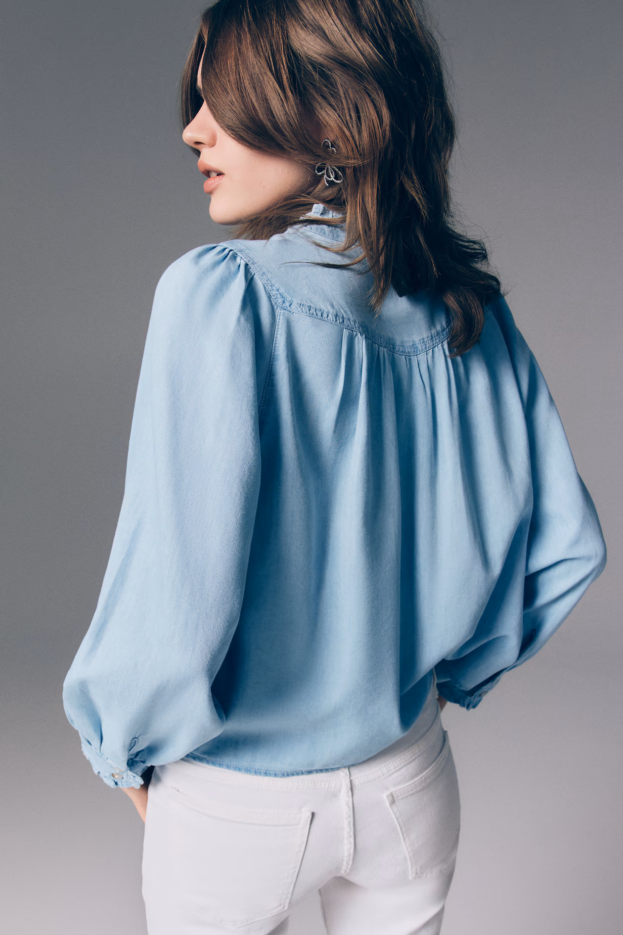 Blouse in lightweight denim made from a cotton and lyocell blend. Ruffle collar, buttons at front, and a yoke with gathers at front and back. Long puff sleeves and ruffle-trimmed cuffs with button.