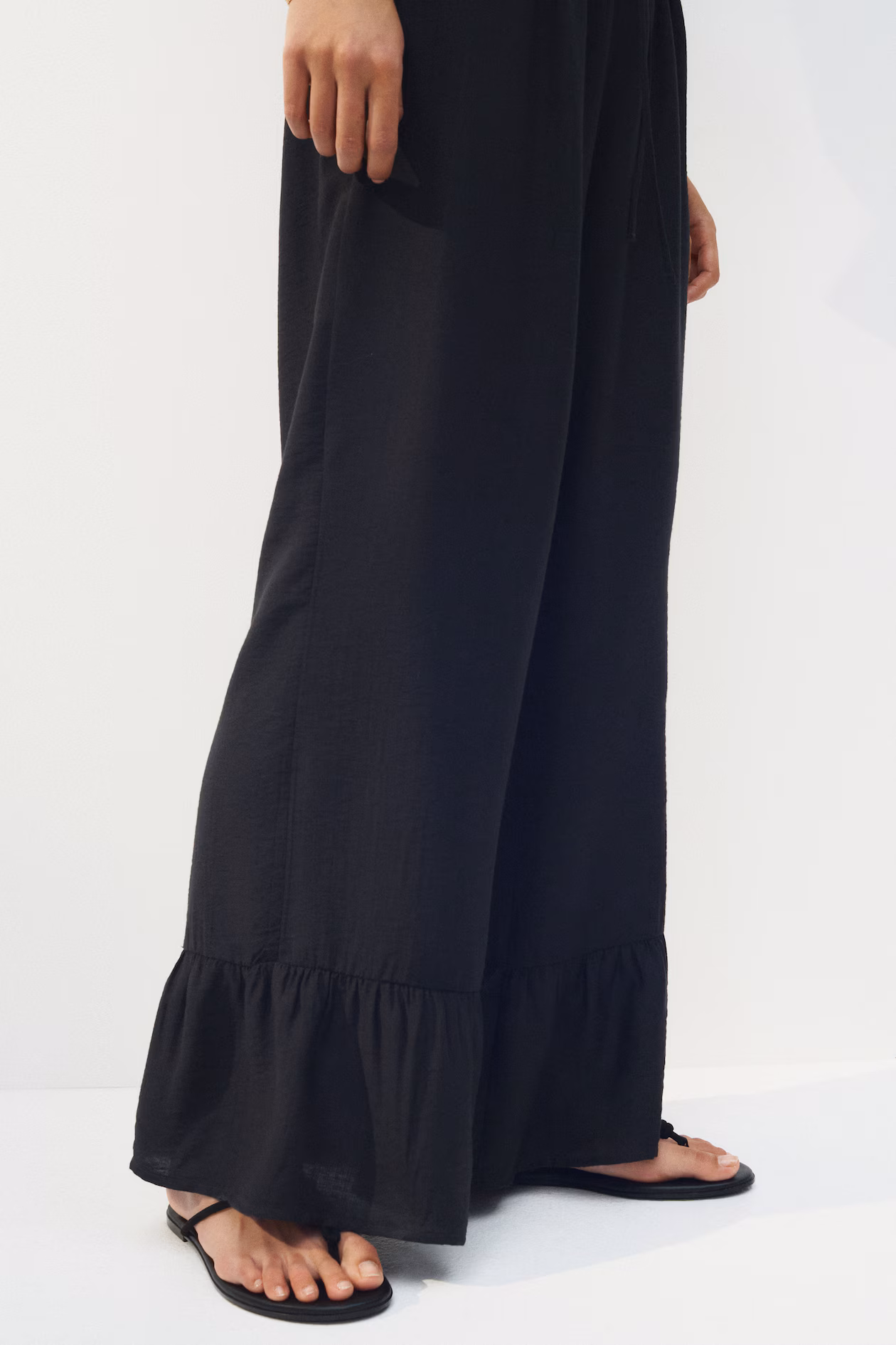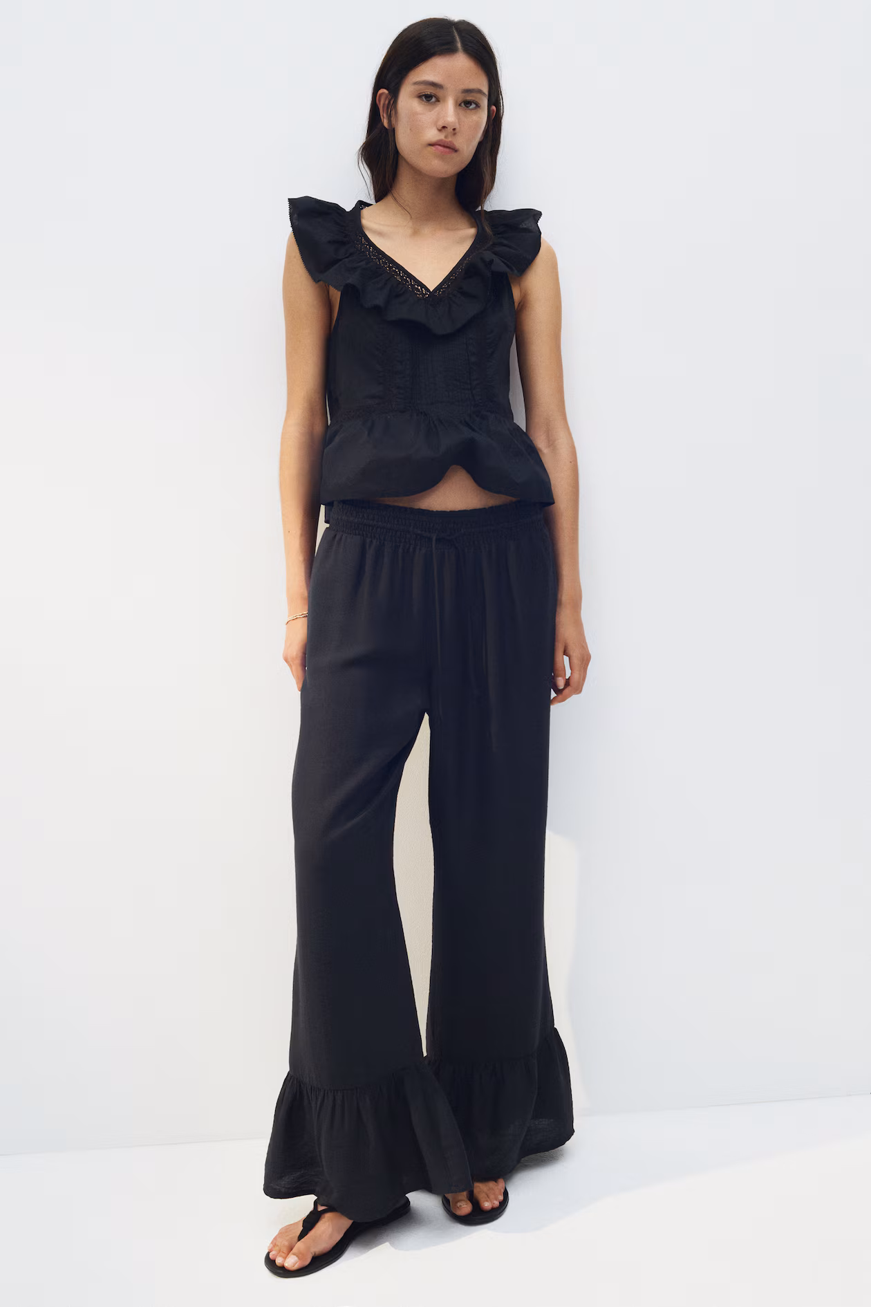 Ankle-length pants in woven fabric. High waist, narrow drawstring and smocked elastic at waistband, and straight legs with a wide ruffle at hems.