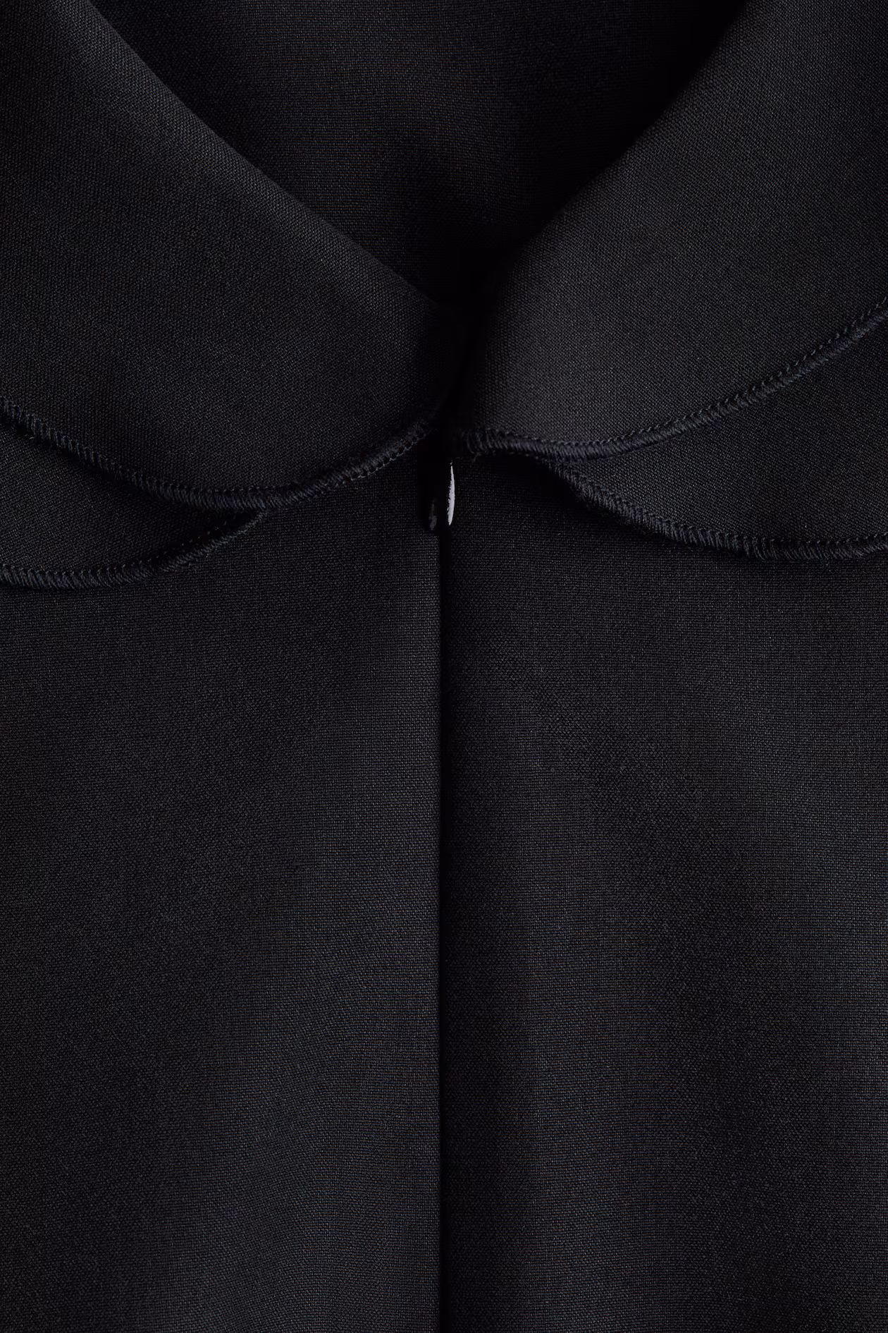 Short, fitted dress in woven fabric. Round neckline, button at back of neck, and shaping seams at front. Large, ruffle-trimmed opening at back above a concealed zipper. Long sleeves and cuffs with layered ruffle trim.