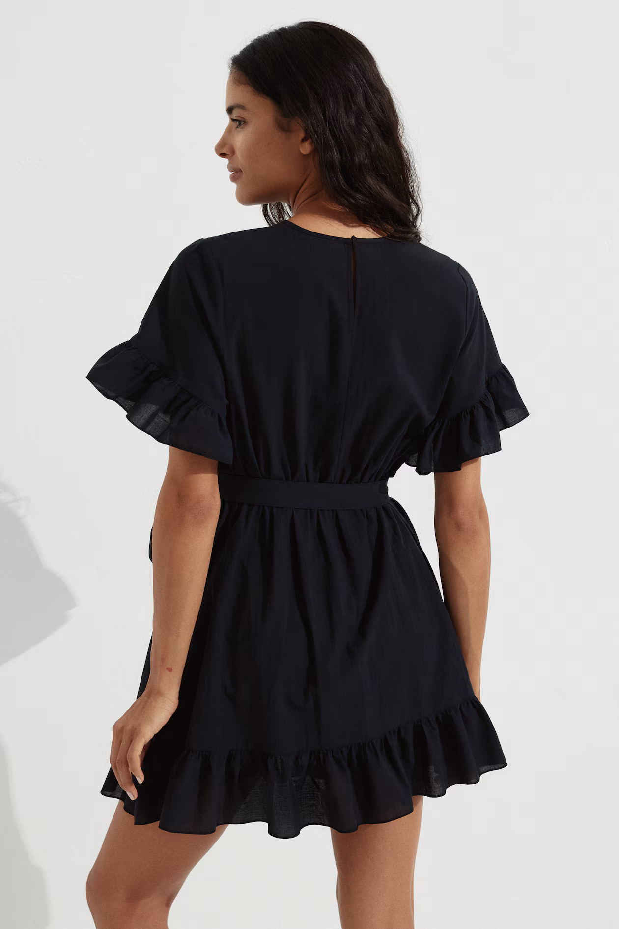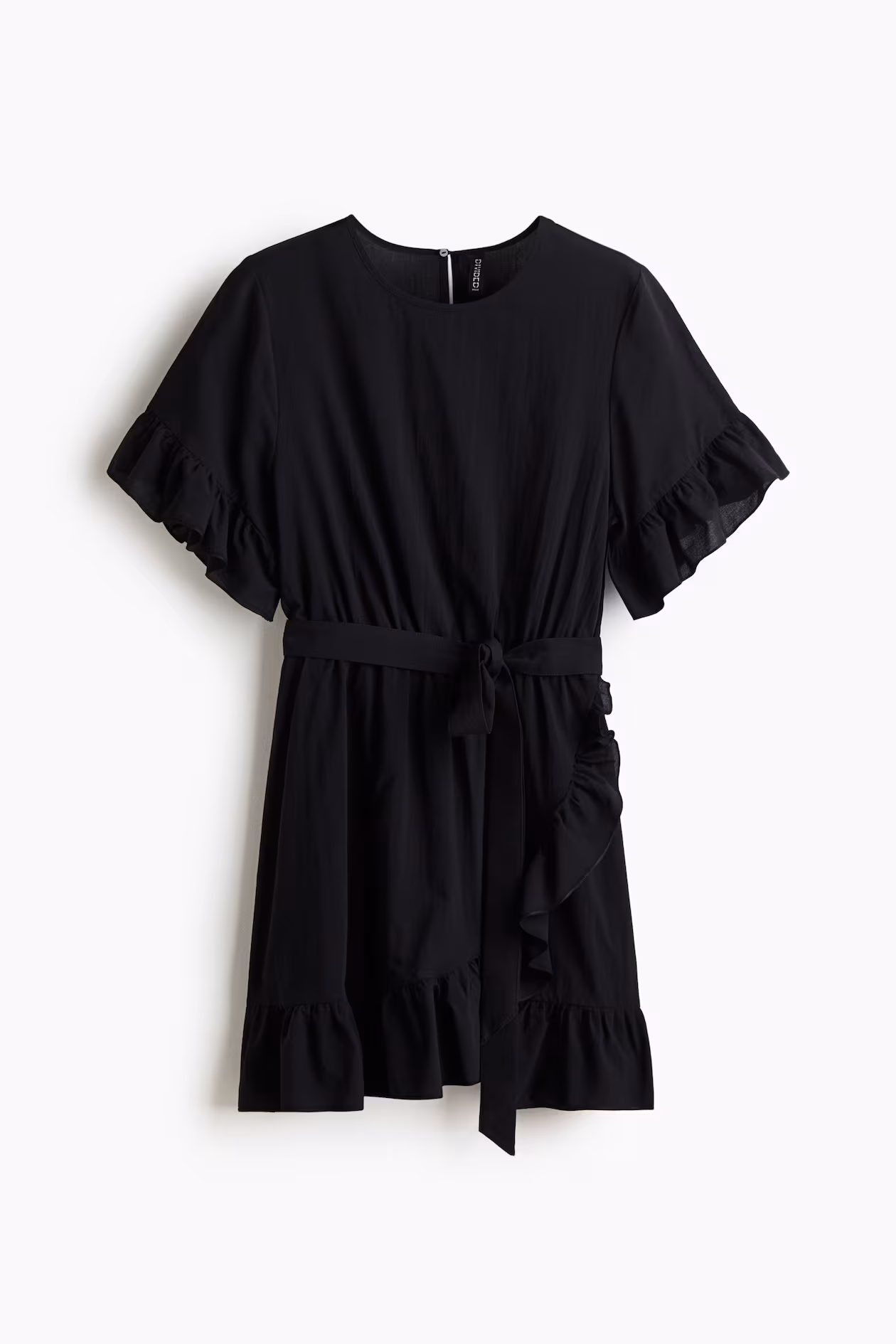Short dress in woven cotton. Round neckline, keyhole opening at back with concealed button, and flutter sleeves with a wide ruffle at cuffs. Removable tie belt at waist and a wrapover skirt with a wide ruffle at hem. Jersey lining.