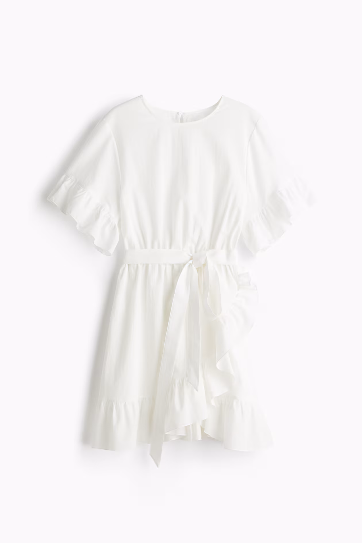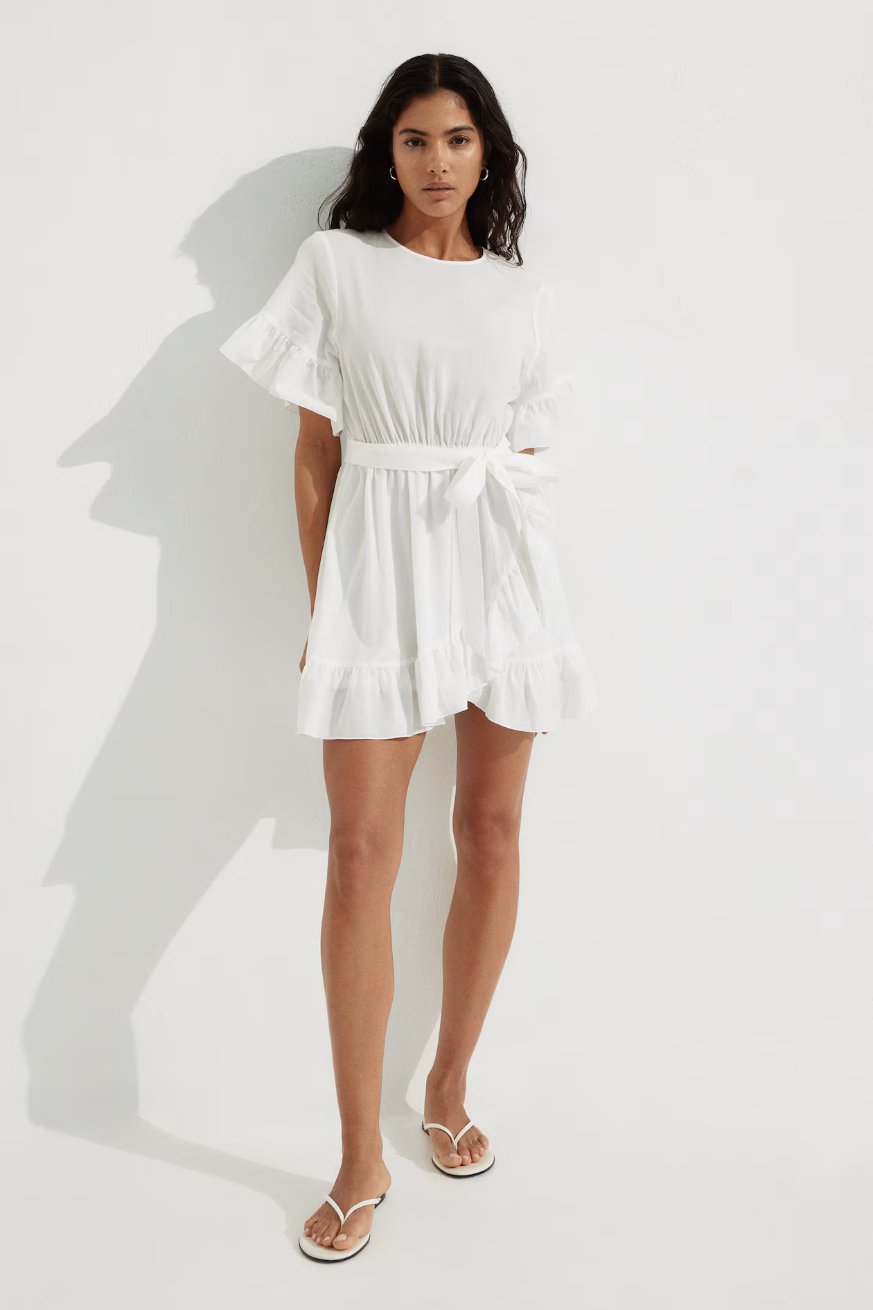 Short dress in woven cotton. Round neckline, keyhole opening at back with concealed button, and flutter sleeves with a wide ruffle at cuffs. Removable tie belt at waist and a wrapover skirt with a wide ruffle at hem. Jersey lining.
