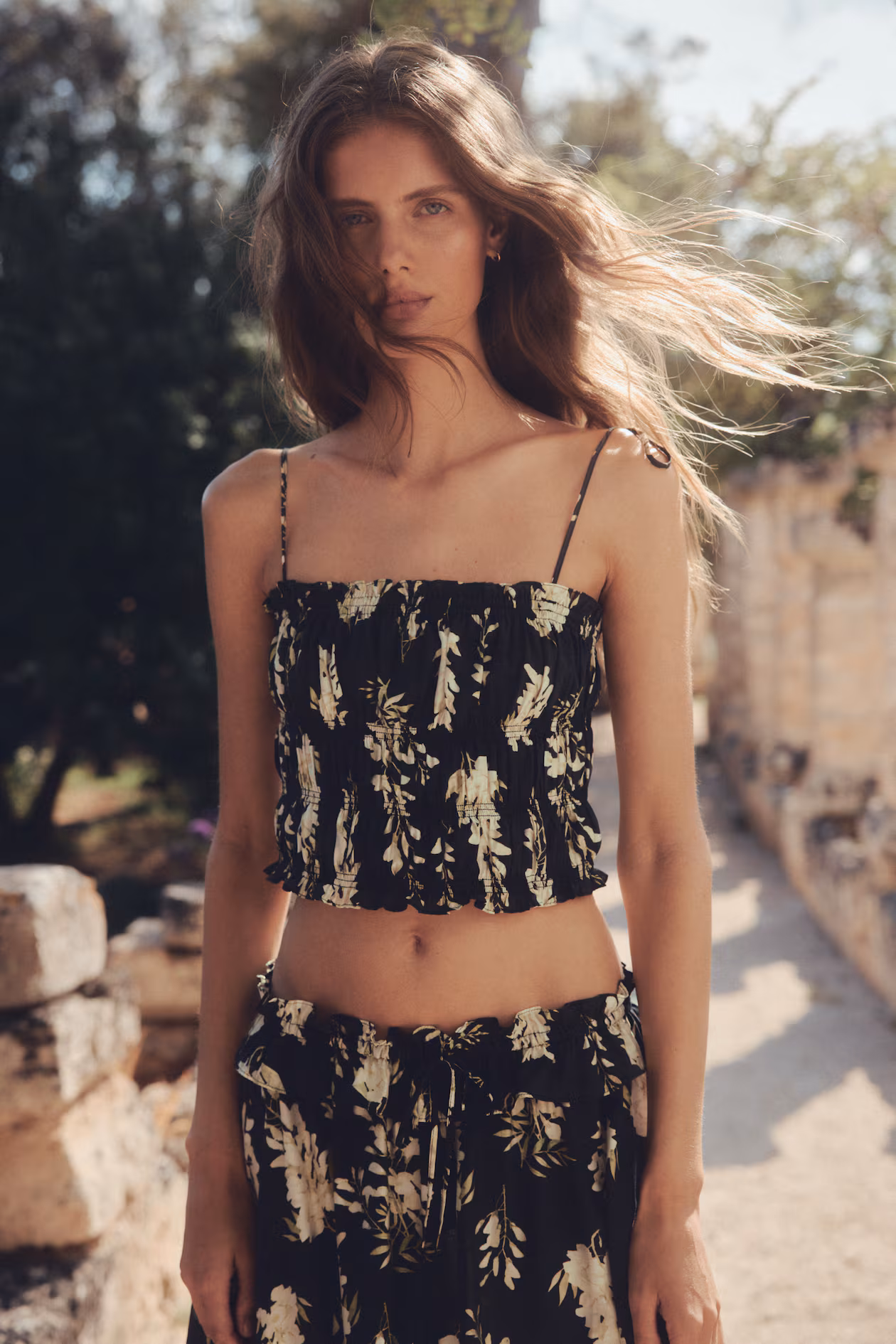 Flared maxi skirt in a woven viscose blend. High waist and ruffle-trimmed waistband with covered elastic and a narrow drawstring. Unlined.