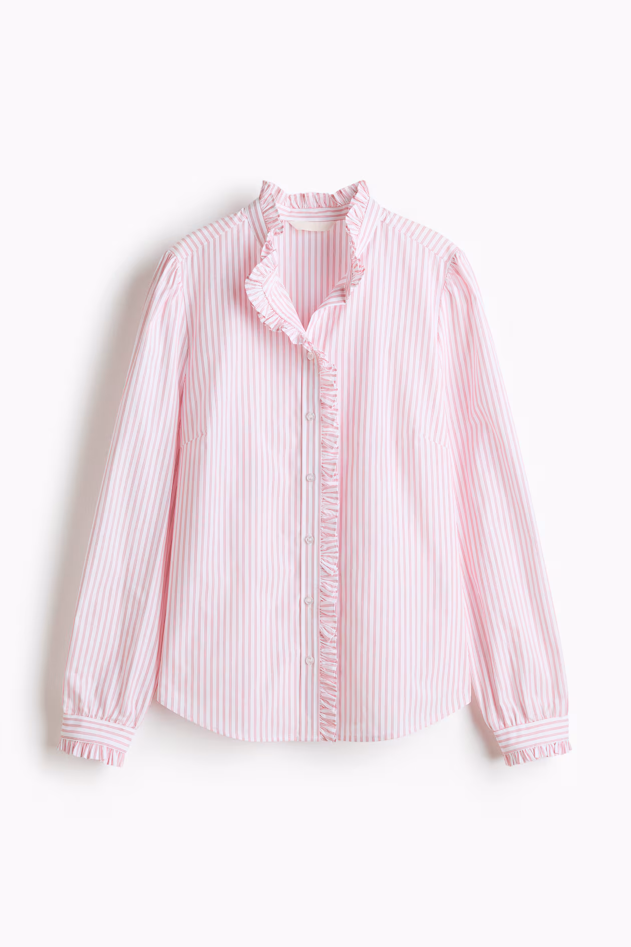 Fitted blouse in crisp poplin. Band collar, buttons at front, gathers on shoulders, and long sleeves with a slit and button at cuffs. Ruffle-trimmed collar, placket, and cuffs.