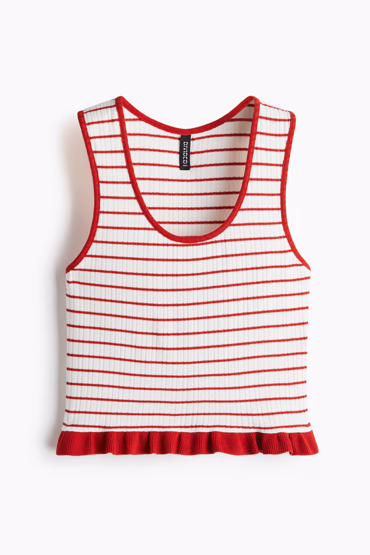 Short, fitted tank top in a fine rib knit. Scoop neck and ruffle trim at hem.