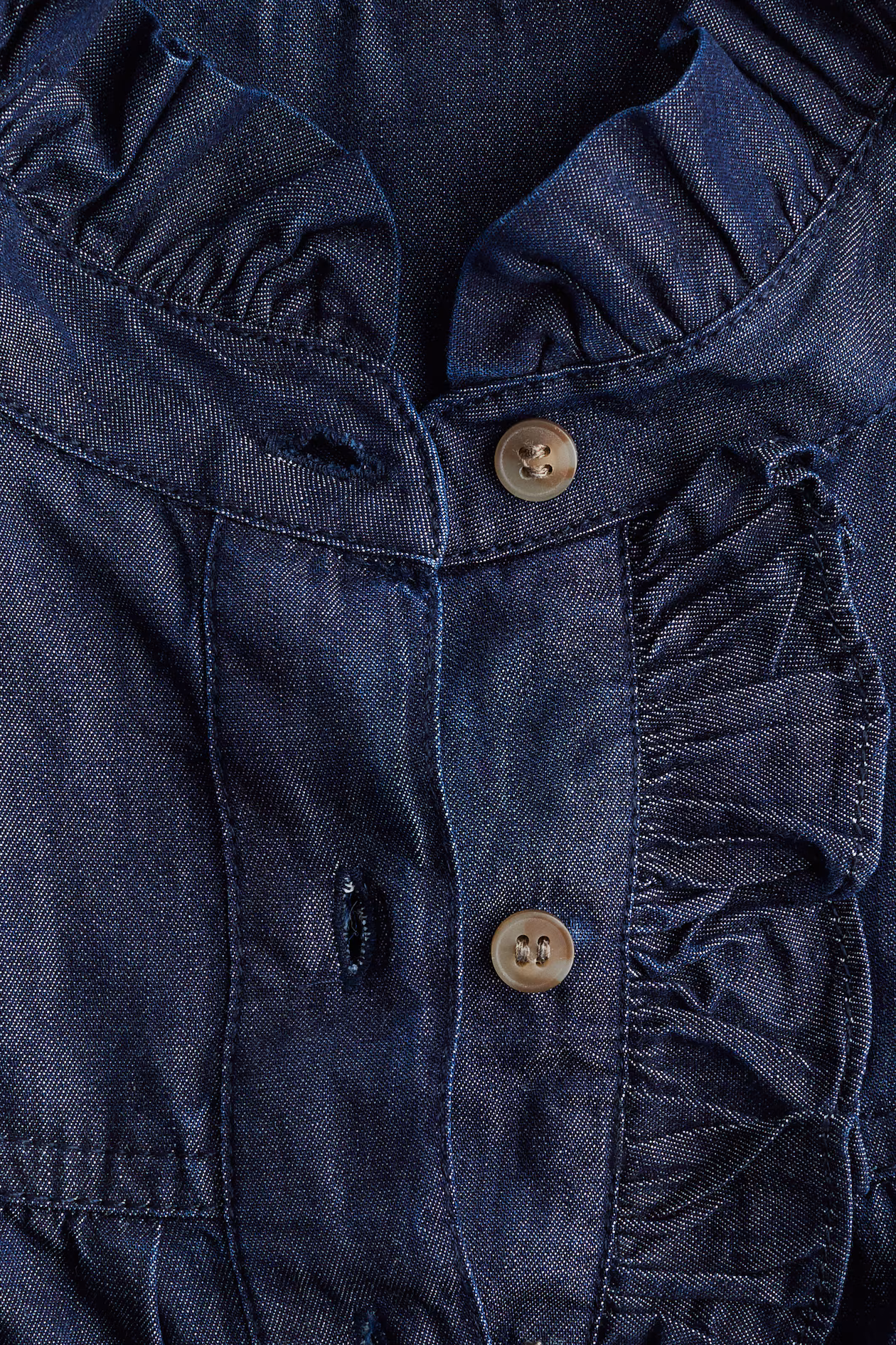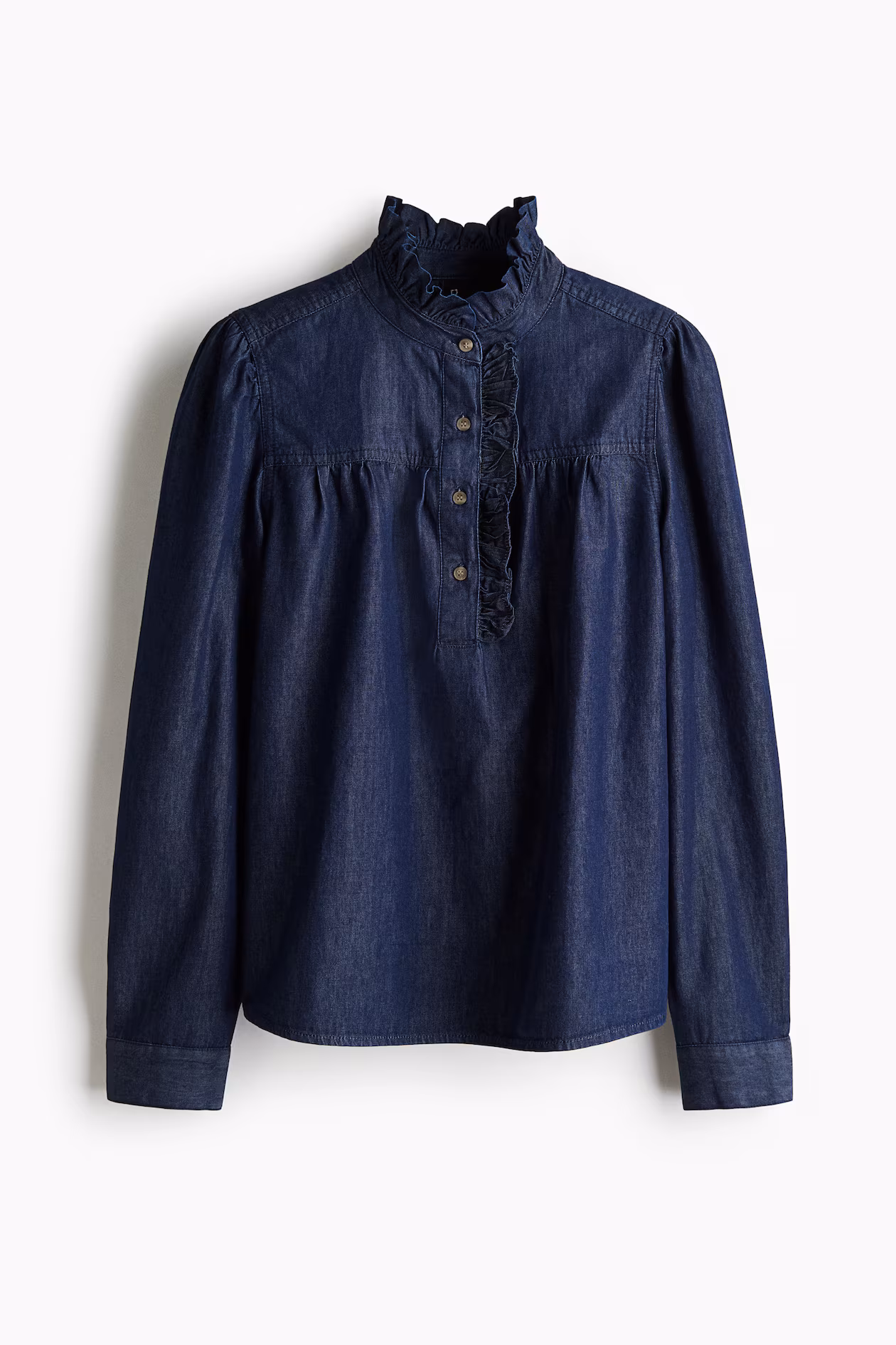 Blouse in cotton denim. Ruffled collar, ruffle-trimmed button placket, and a gathered yoke at front and back. Long balloon sleeves with button at cuffs. Rounded hem.