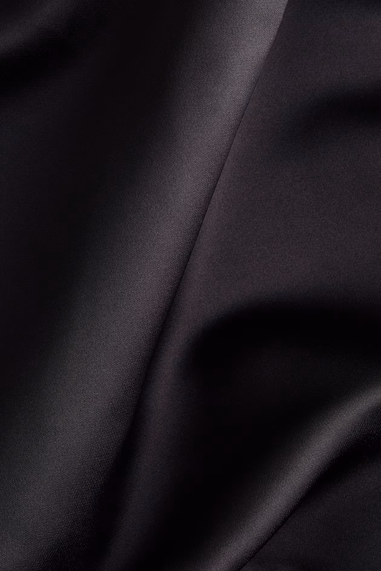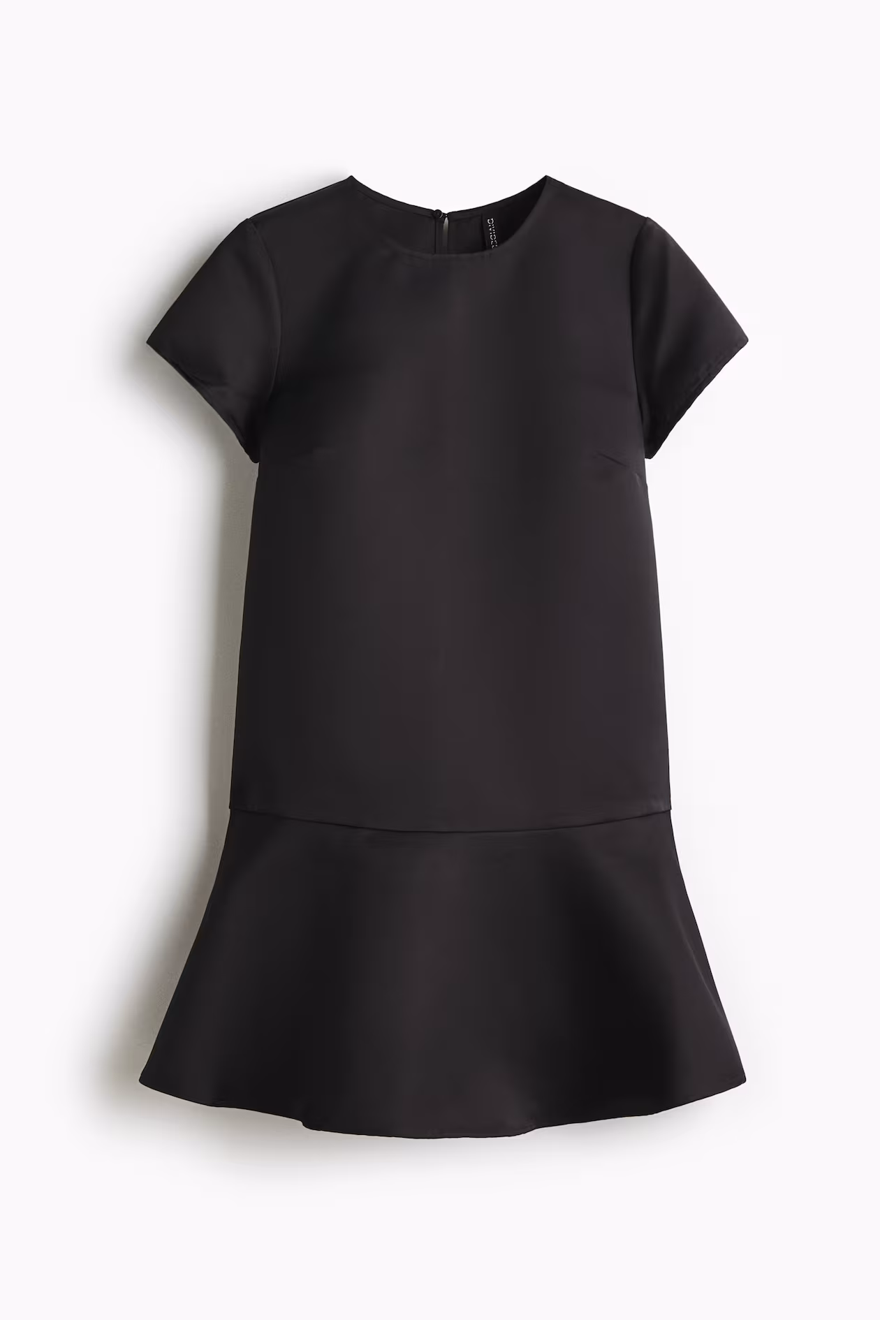 Short, loose-fit dress in satin with a boxy silhouette. Round neckline, keyhole opening at back of neck with button, and short sleeves. Darts at bust, seam at hips, and a flared skirt. Unlined.