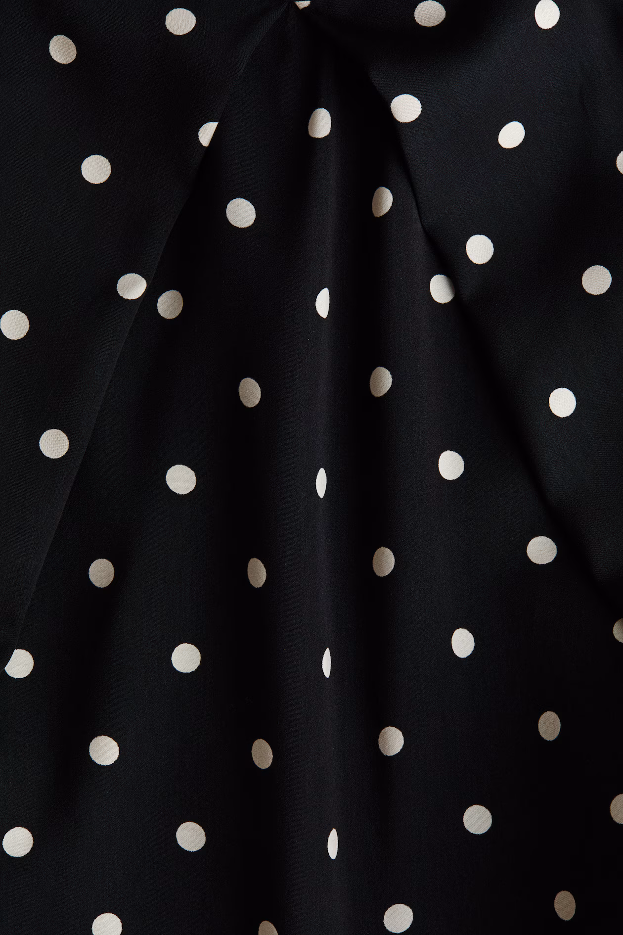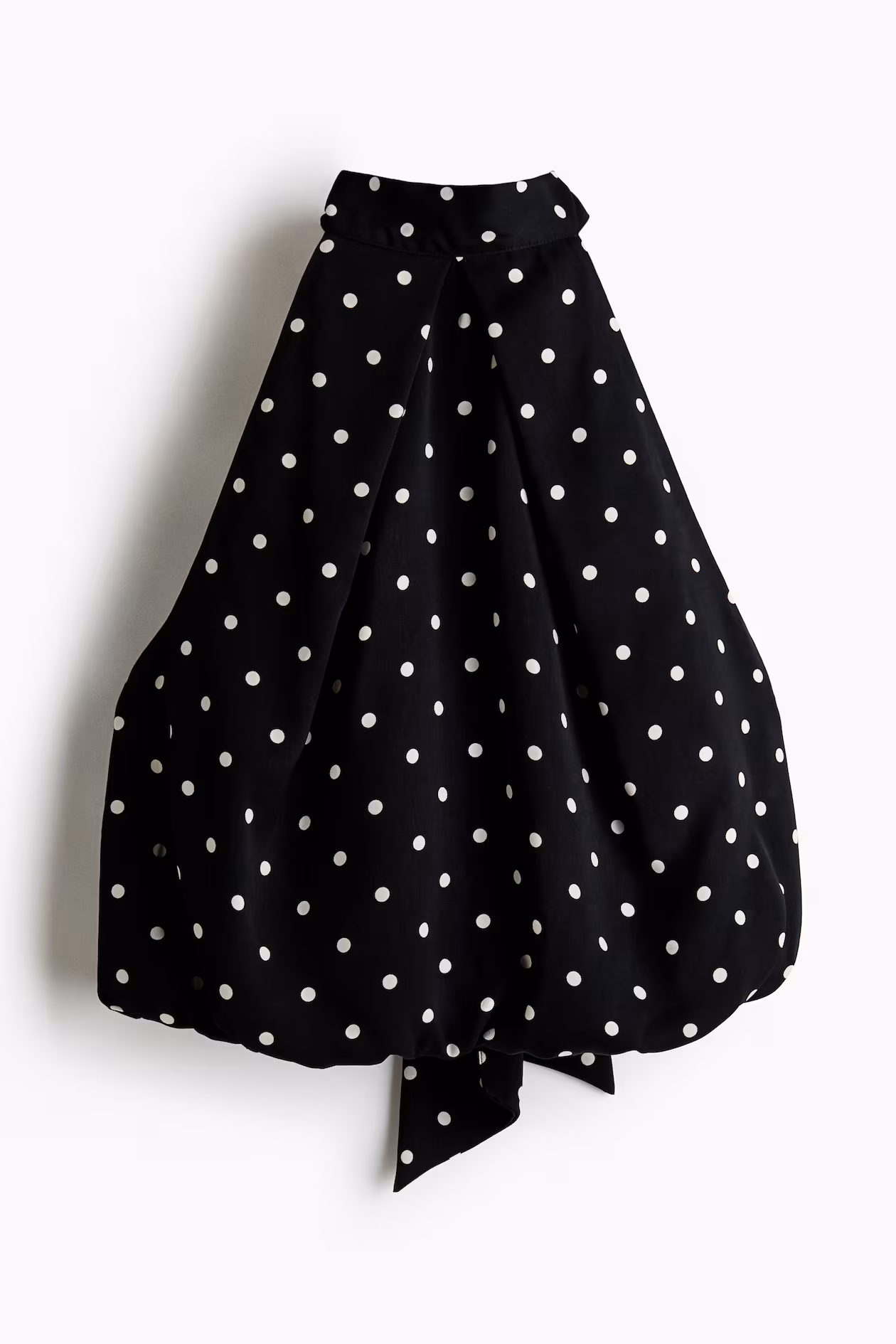 Top in satin. Narrow cut at top with gathers at front and wide halterneck ties at back. Bubble hem at front and an open back with covered buttons at hem. Lined.