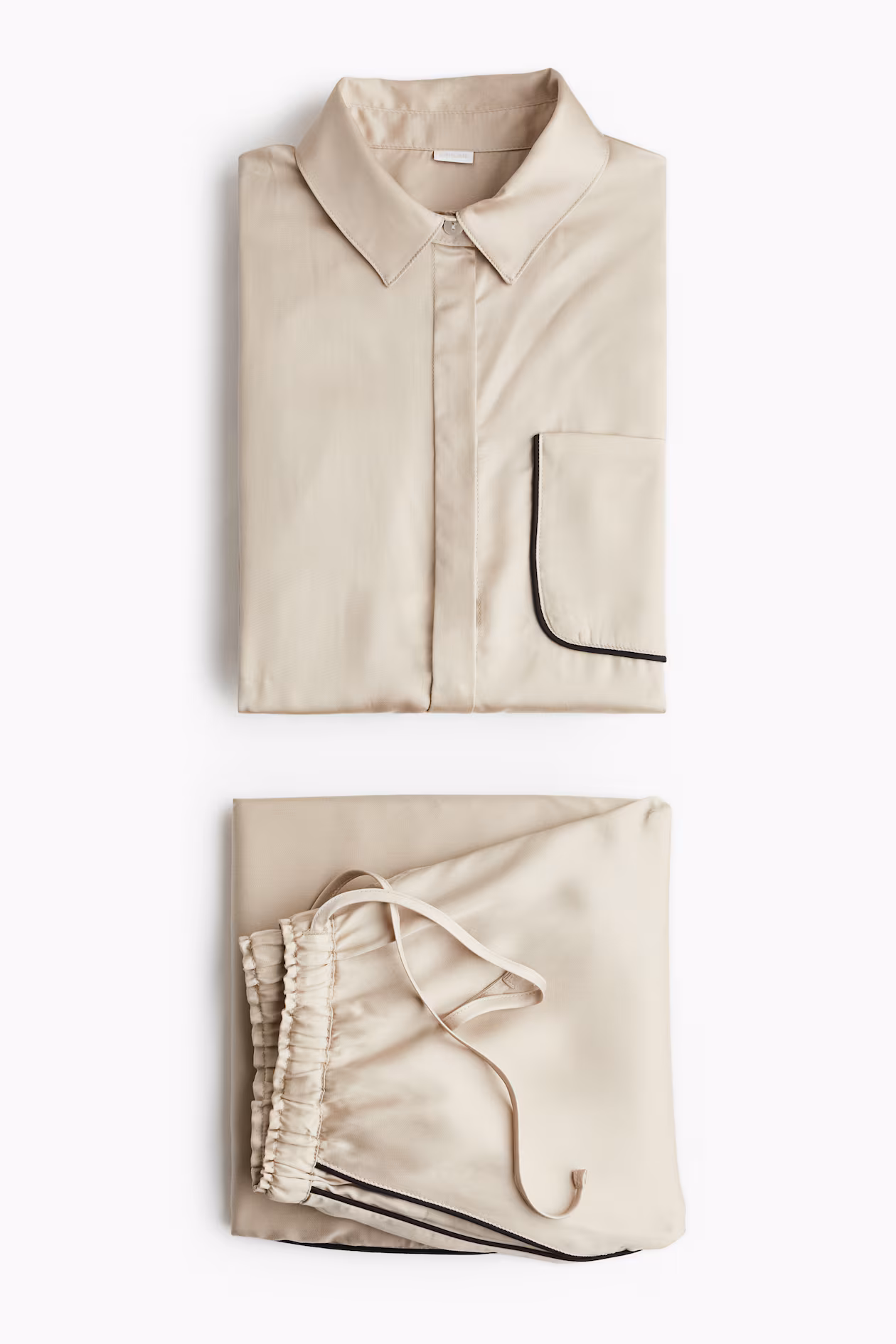 Pajama shirt and pants in softly draped satin with contrasting piping. Long-sleeved shirt with a turn down collar, concealed buttons at front, and an open chest pocket. Pants with an elasticized, drawstring waistband, side-seam pockets, and wide legs.