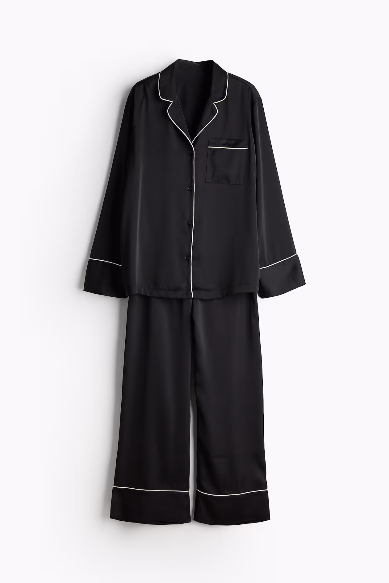 Pajama shirt and pants in softly draped satin with piped trim in an accent color. Shirt with resort collar, buttons at front, an open chest pocket, and long sleeves. Pants with an elasticized, drawstring waistband and wide legs.