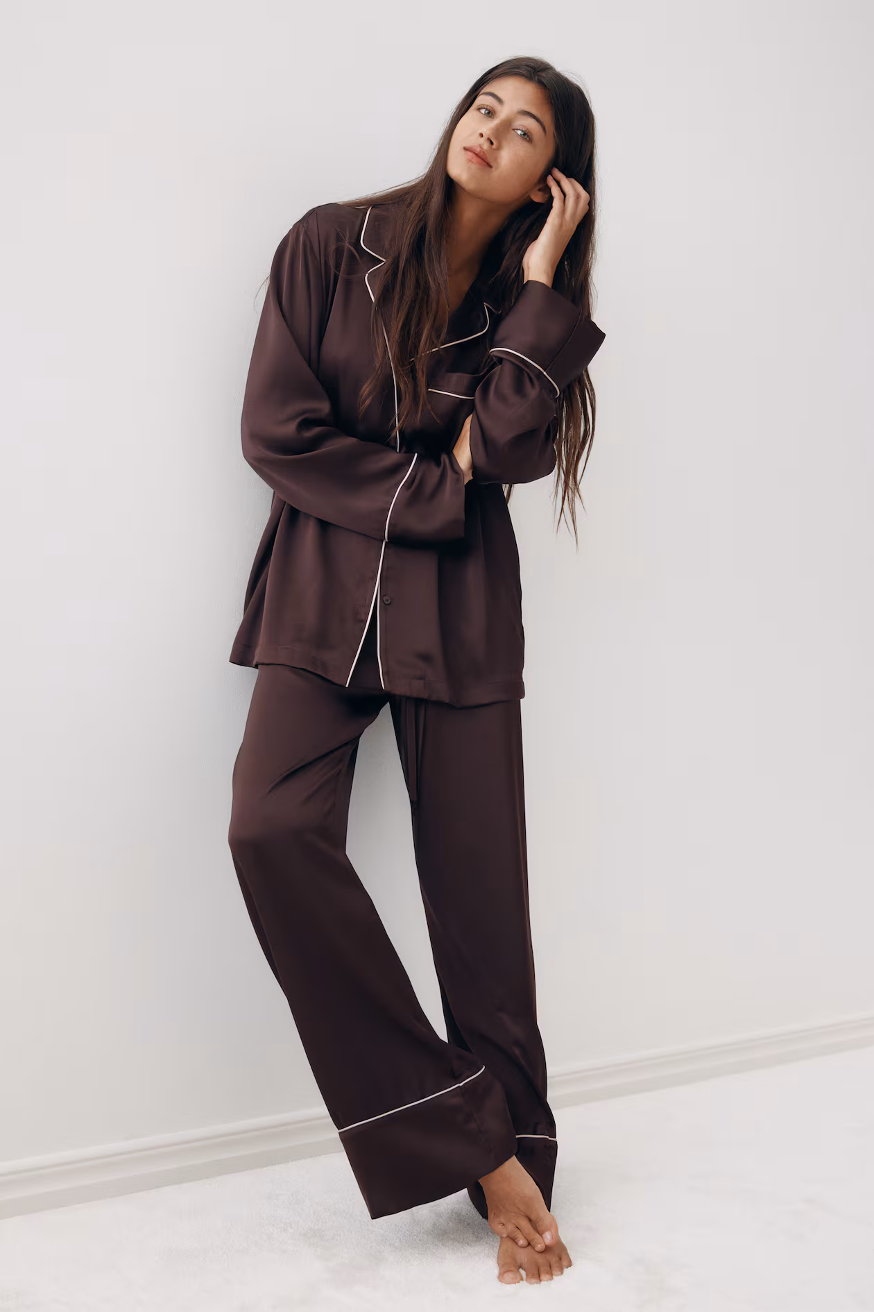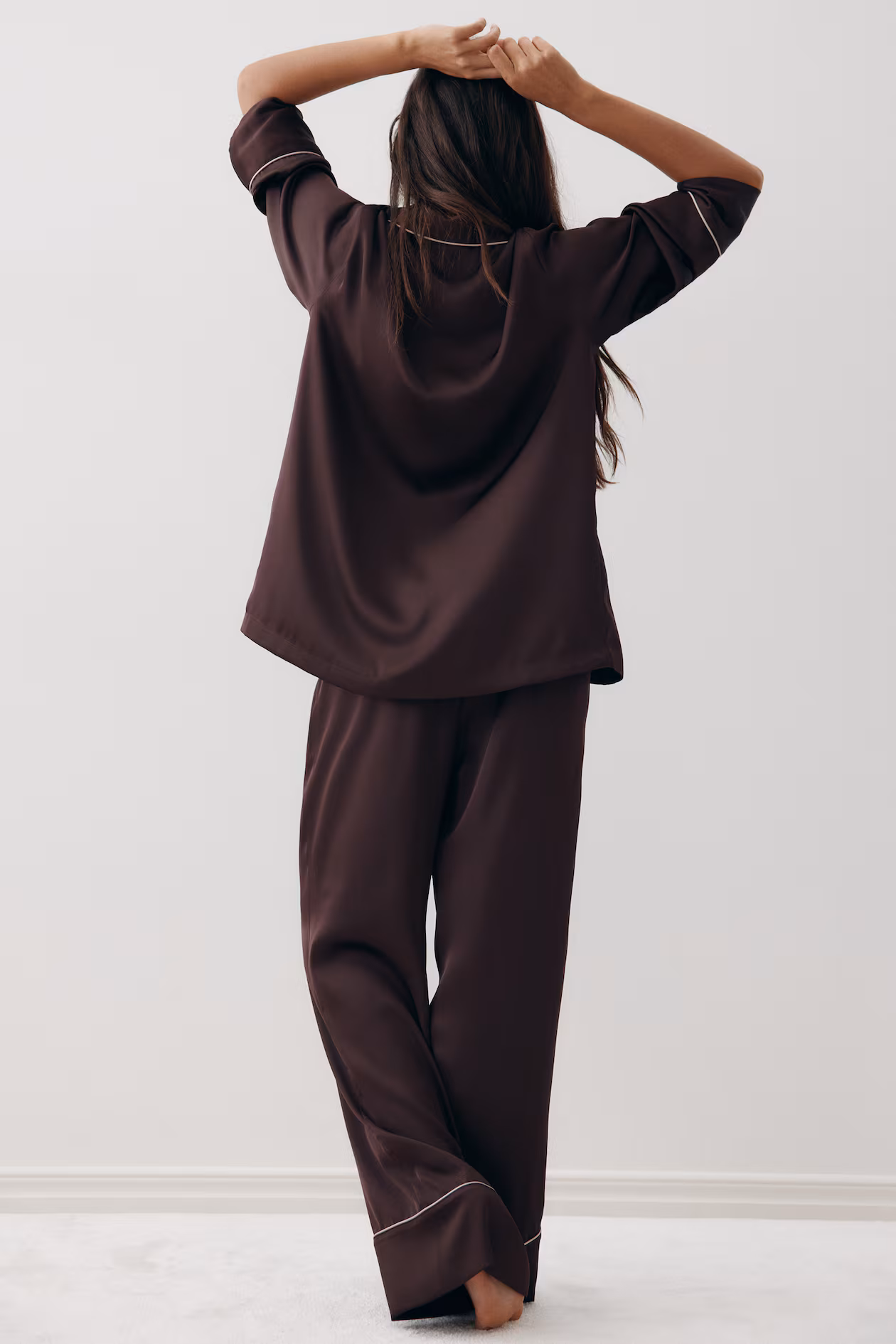 Pajama shirt and pants in softly draped satin with piped trim in an accent color. Shirt with resort collar, buttons at front, an open chest pocket, and long sleeves. Pants with an elasticized, drawstring waistband and wide legs.