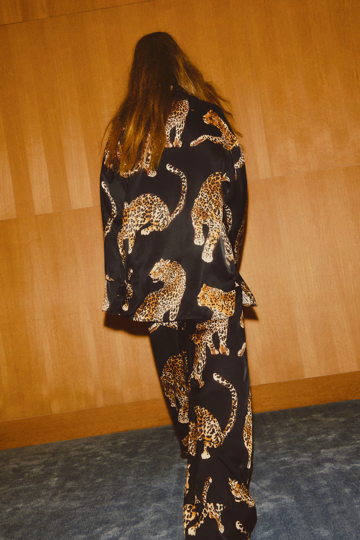 Loose-fit pants in softly draped viscose satin. High waist, narrow drawstring and covered elastic at waistband, and wide legs with narrow piping above hems.